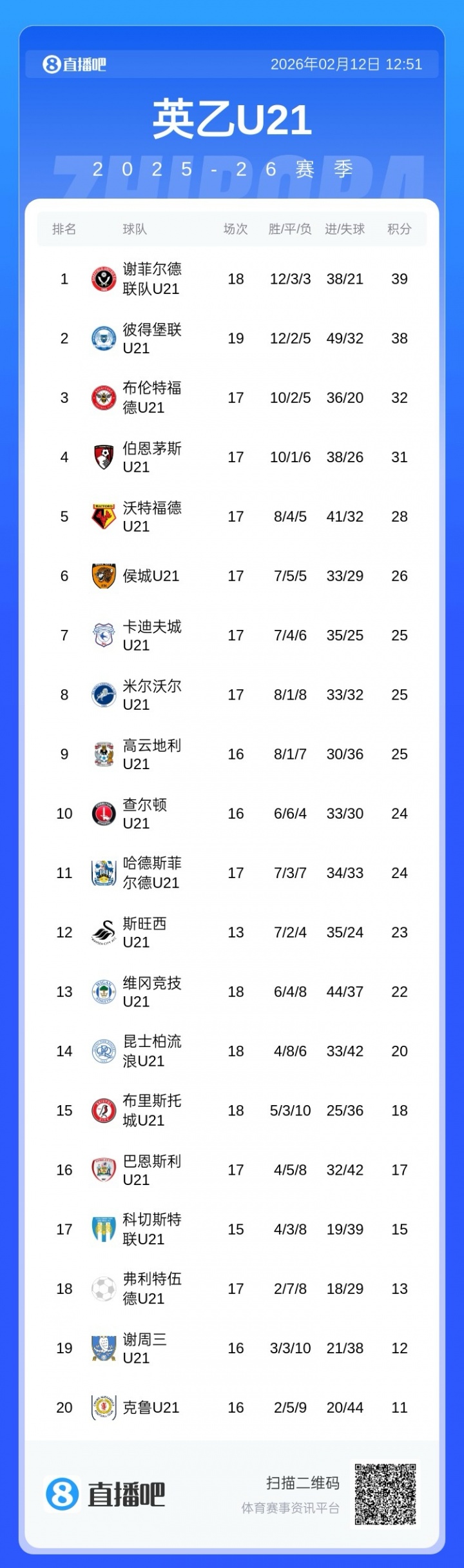 职业发展联赛积分榜:巴恩斯利U21排名第16