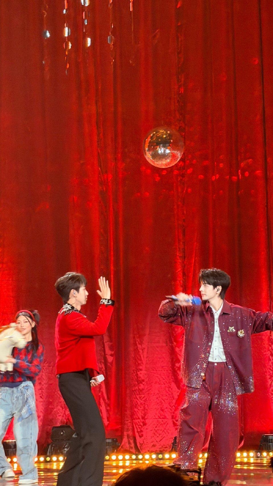 唐九洲就这么等着和蒲熠星击掌 唐九洲执着等待击掌的样子也太萌了!和蒲熠星同框红色穿搭年味十足,舞台合唱默契在线,一个伸手一个回应,互动细节甜到不行!
