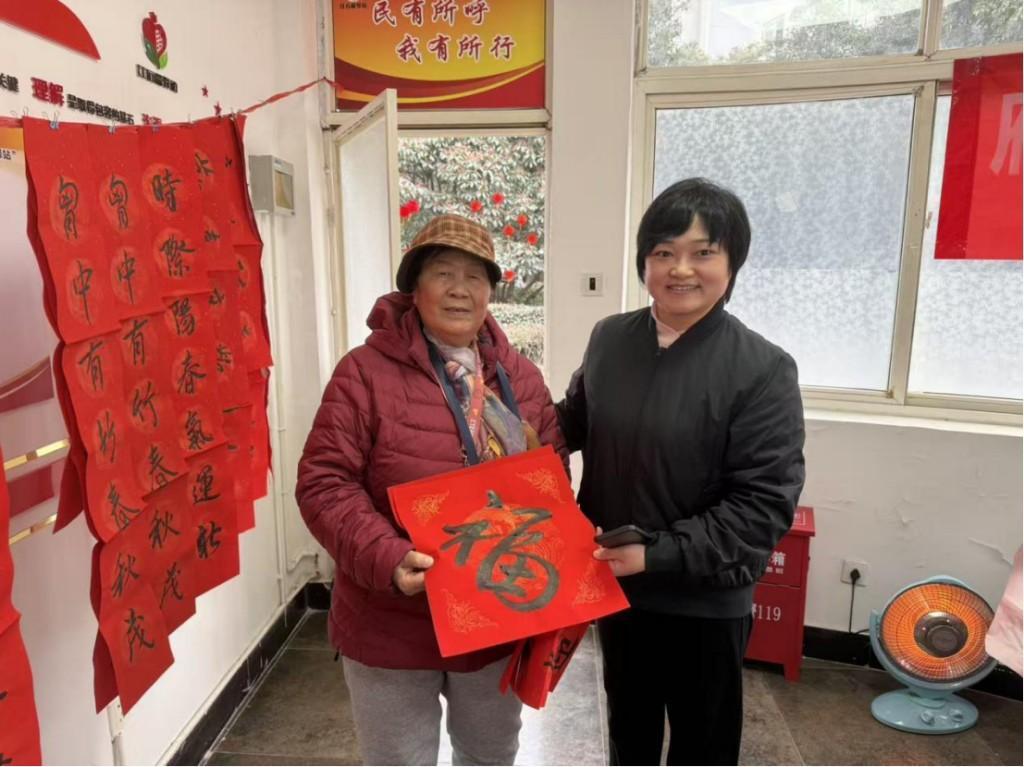 金业缇香山小区同样热闹非凡。书法爱好者凝神运笔,福字与春联接连完成。居民们驻足欣赏、踊跃领取,脸上洋溢着笑容。“手写的春联才有年味!”一位老人捧着墨迹未干的对联连连称赞。