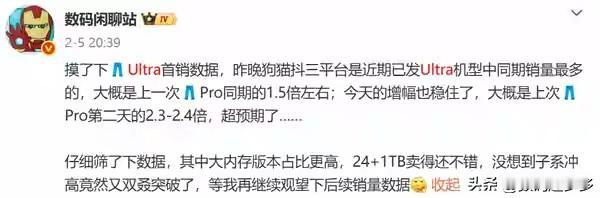据博主“RD观测”通过社交平台曝光了iQOO 15 Ultra首销三天的数据,该机首销前三天的销量已接近20K(即2万台)。 iQOO 15 Ultra在京东、天猫、抖音三平台是“近期已发Ultra机型中同期销量最多的”,整体销量约为前代iQOO 12 Pro同期的1.5倍左右,且后续销量增幅一度达到2.3至2.4倍,表现“超预期”。仔细看了数据,24GB+1TB卖得不错,子系冲高又双叒叕突破了 可喜可贺。数码趣多多辣评 畅聊数码新品