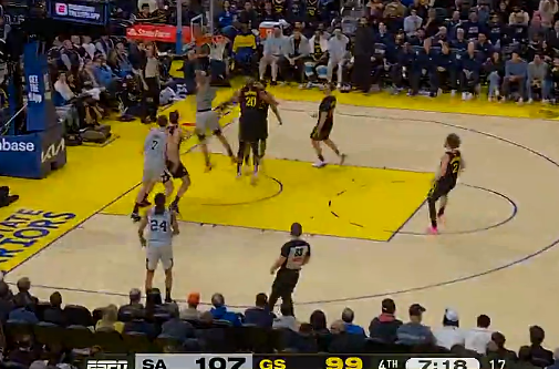 第四节比赛,哈珀快攻反击上篮再中,马刺末节已领先勇士10分。