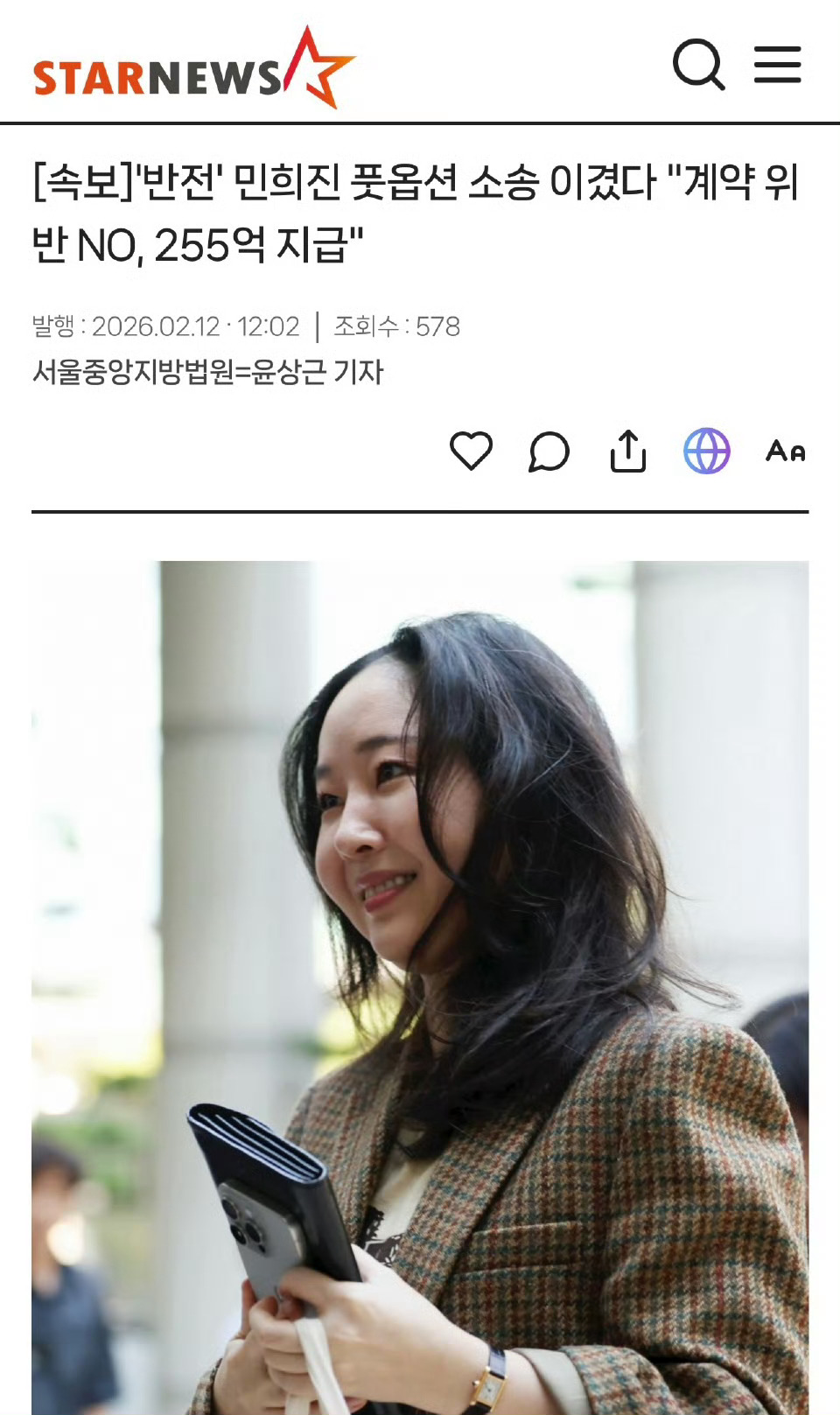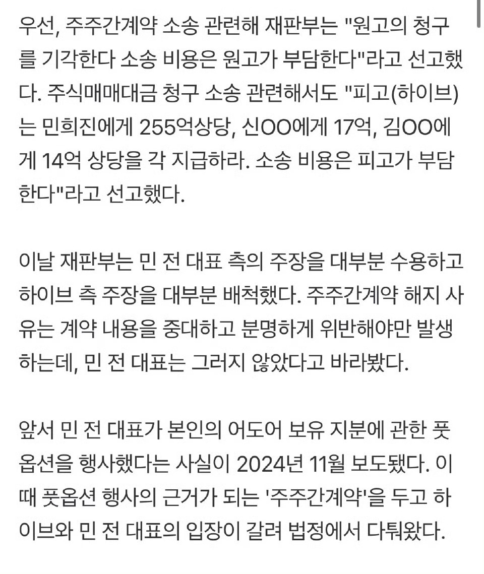 闵熙珍胜诉,法院大体采纳了闵熙珍前代表一方的主张,并驳回了HYBE一方的大部分主张,HYBE需向闵熙珍支付255亿韩元。
