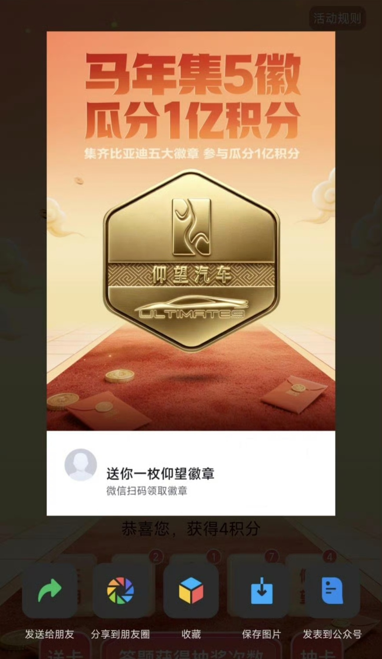 比亚迪马年集徽享好礼活动来咯!2026年2月13日到20日,打开比亚迪APP就能玩“马年集五徽”,就算不是车主也能参加,门槛是真的低。这次集齐王朝、海洋、方程豹、腾势、仰望这五款徽章,就能合成集团大徽章,一起分1亿积分!这数字看着都心动,感觉拼手气的时候到了。每天登录和答答题就能抽卡,整个活动最多能拿106次,机会给得挺足。还会轮流有品牌宠粉日,当天对应徽章概率直接提到20%,而且徽章能转给朋友互助,这个设计还挺贴心,适合组队一起玩。攒下来的积分能换周边、保养服务,也能兑京东好物,实用性不错。开奖日专门定在大年初五财神节,配合节日气氛,搞不好真能攒个人品爆发。整体看这波活动福利给得大方,玩法也简单,有时间的话确实可以顺手参与一下!