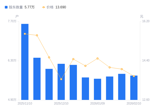 日期A股户数(户)流通A股户均持股数(股)户均持股市值(万元)2026-02-105766710915.8914.942026-01-305829410798.4815.132026-01-205734410977.3815.472026-01-095654011133.4816.142025-12-315699811044.0215.642025-12-196148510237.9714.812025-12-106186510175.0913.792025-11-286006310480.3615.252025-11-20640369830.1215.302025-11-10761058271.2312.93