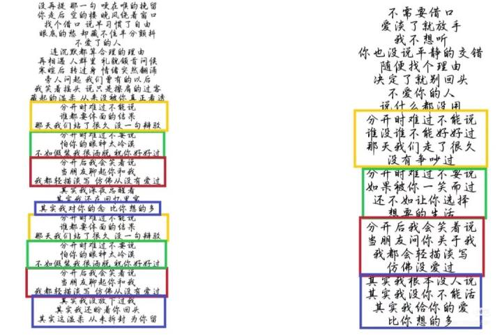《其实》中的部分歌词被原封不动地照搬,如“分开时难过不能说”“分开后我会笑着说”等。部分歌词则在原句基础上进行了删改,例如“其实我给你的爱比你想的多”被改为“其实我对你的念比你想的多”。