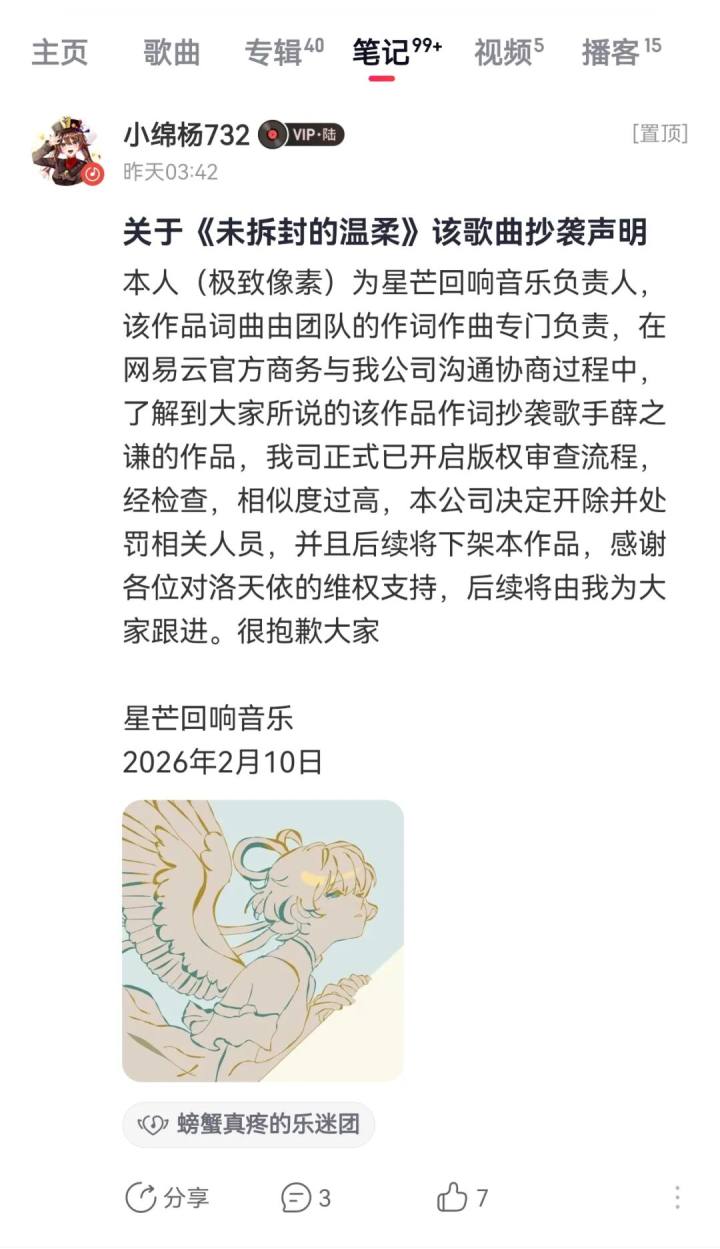 2月10日,星芒回响音乐负责人发布声明称,该作品词曲由团队的作词作曲专门负责,了解到大家所说的该作品作词抄袭歌手薛之谦的作品,我司已正式开启版权审查流程,经检查,相似度过高,本公司决定开除并处罚相关人员,并且后续将下架本作品,感谢各位对洛天依的维权支持。