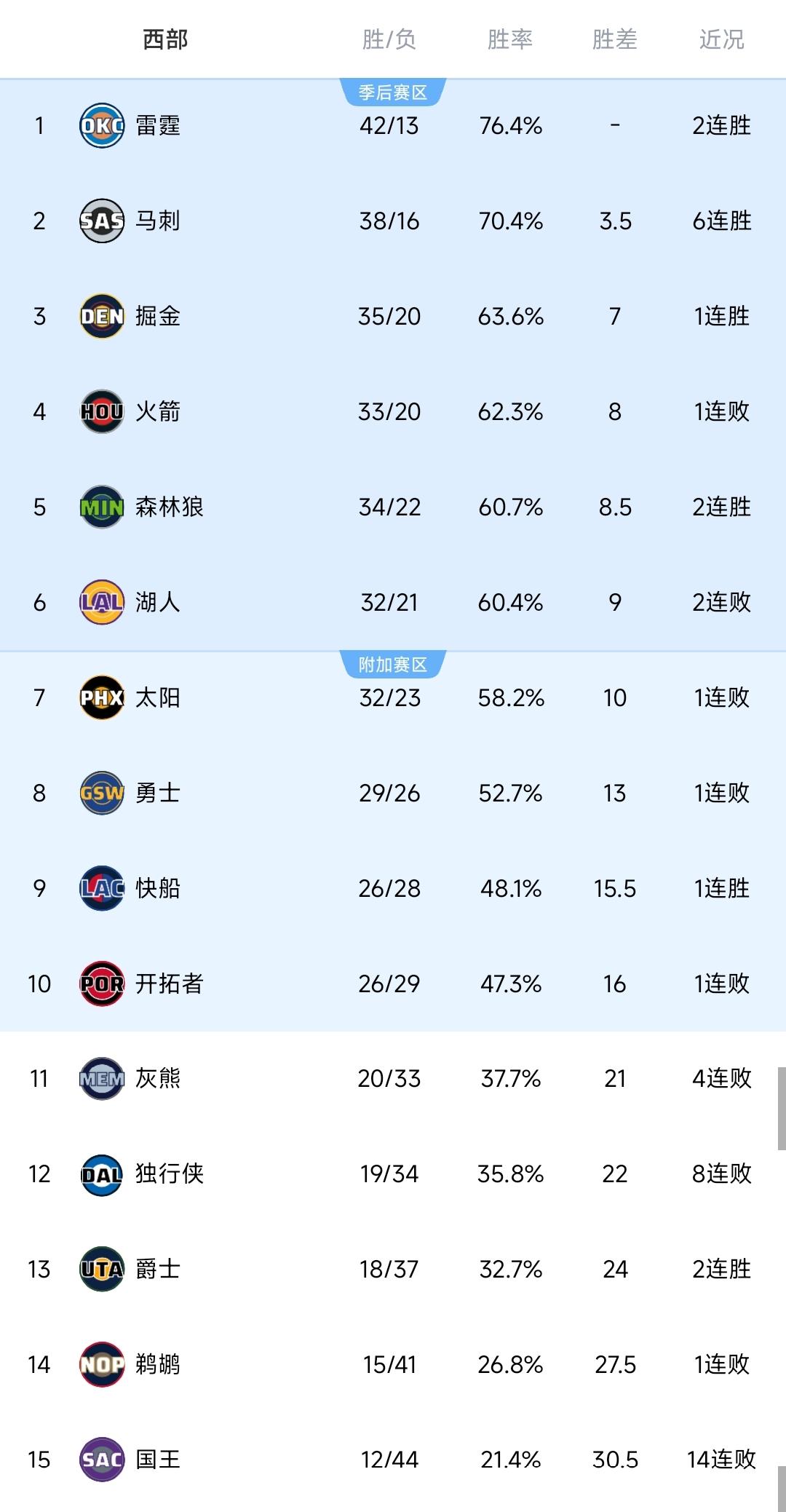 NBA西部最新排名! 马刺逆转勇士,坐稳第二的位置! 快船准绝杀升第九,湖人掉第六! 北京时间2月12日,NBA常规赛火热进行。 ①森林狼133-109大胜开拓者,攻防两端表现均衡,从始至终几乎都占据主导权,面对反扑是处理得游刃有余,并没给希望,兰德尔末节狂砍23分,全场贡献41分7板,他们战绩变成34胜22负,反超湖人,暂时升至西部第五的位置。杨瀚森出战5分钟得到2分。 ②快船105-102险胜火箭。两队迎来背靠着的二番战,比赛过程是较为激烈,很长一段时间火箭占上风,但他们还是存在以往的相同问题,至关重要的第四节容易掉链子。快船尽显韧性,全员发挥是紧追不舍,逐渐完成反超并顶住压力,最后时刻伦纳德站出来打进关键球上演准绝杀,真是太硬气,26胜28负战绩夺回西部第九。 ③勇士113-126不敌马刺。尽管勇士核心主力缺席,但他们仍旧表现优异,角色球员多点开花,局面势头甚至一度压制,上半场取得领先。下半场马刺慢慢发力,强势反弹吹起猛攻号角,三节结束已经抹平差距,此后状态持续高涨,替补席的约翰逊和哈珀尤为出彩,再加上文班亚马的震慑力,于是一举扭转颓势。