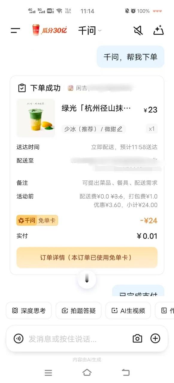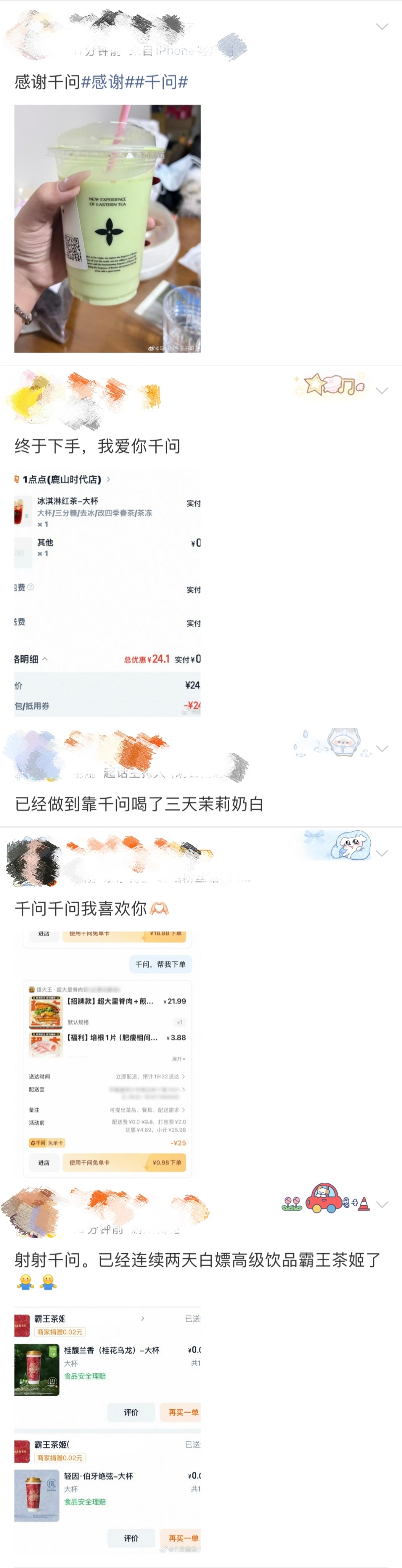 千问说买得开心过两天见年末战绩还得自己报!会玩又会省的千问这次亲手把自己送上新闻。一张25元万能卡,奶茶自由、好物囤货、吃喝玩乐全拿下,第一波活动数据显示,过去6天,用户说了41亿次“千问帮我”,AI完成下单超1.2亿笔,花式玩法让你想不到。AI脑洞解决一切难题,不管谁来点单统统都让人满意,连社交平台都被千问新人的抢手程度刷屏。虽然这一次的千问狂欢暂歇,但下一次想必也不会太远了!