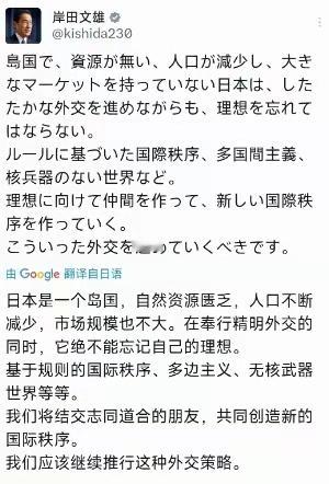 岸田文雄一语道破日本现在的处境,他表示日本是一个岛国,存在自然资源匮乏、人口不断减少等问题,所以日本在奉行精明外交的同时,绝不能忘记自己的理想,此外日本还应该结交志同道合的国家,共同建立新的国际秩序。