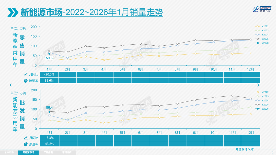 1月新能源乘用车市场零售59.6万辆,同比下降20.0%;1月常规燃油乘用车零售94.8万辆,同比下降10%。