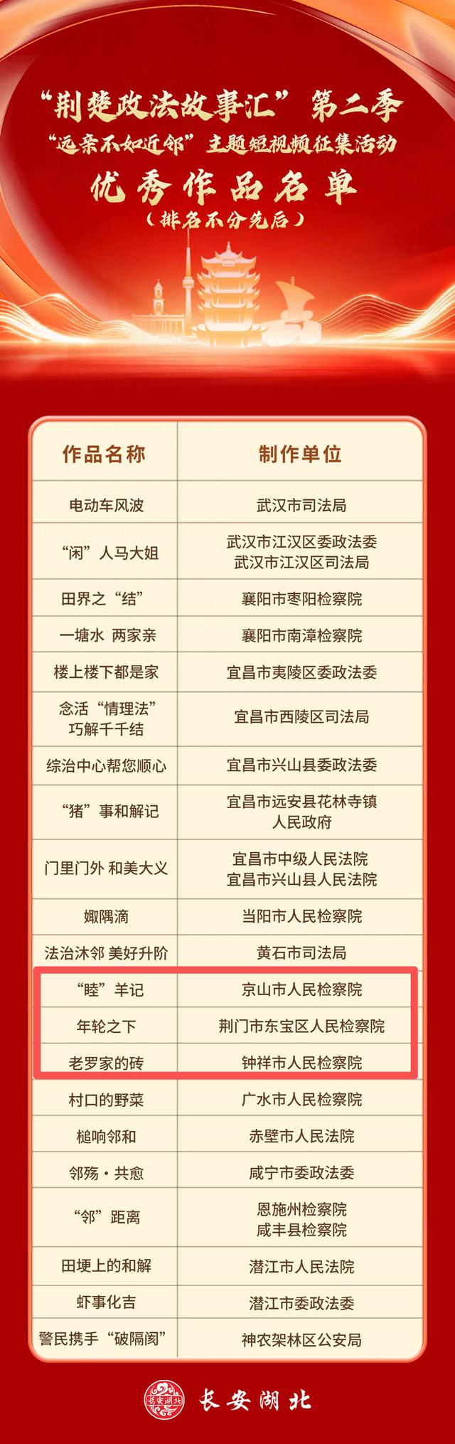邻里和谐是中华民族的传统美德,良好的邻里关系是构建和谐社会的重要基石。近日,“荆楚政法故事汇”第二季“远亲不如近邻”主题短视频征集活动结果正式发布,湖北省委政法委从各地各部门报送的105部作品中选出21部优秀作品。其中,荆门检察机关3个作品入选。