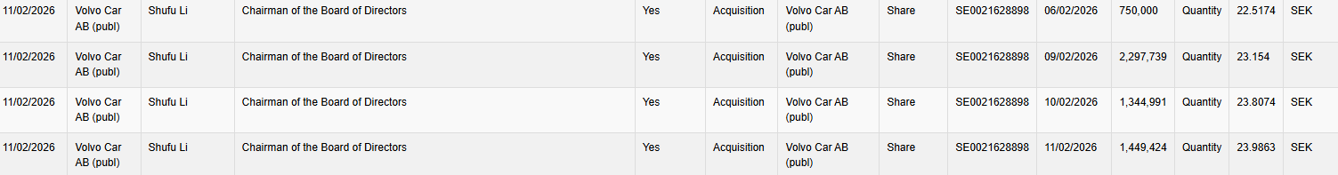2月12日消息,瑞典金融监管局官网信息显示,GeelyInternationalHongKongLimited于当地时间2月11日购入近145万股沃尔沃汽车股票,购入价格约为每股23.99瑞典克朗。