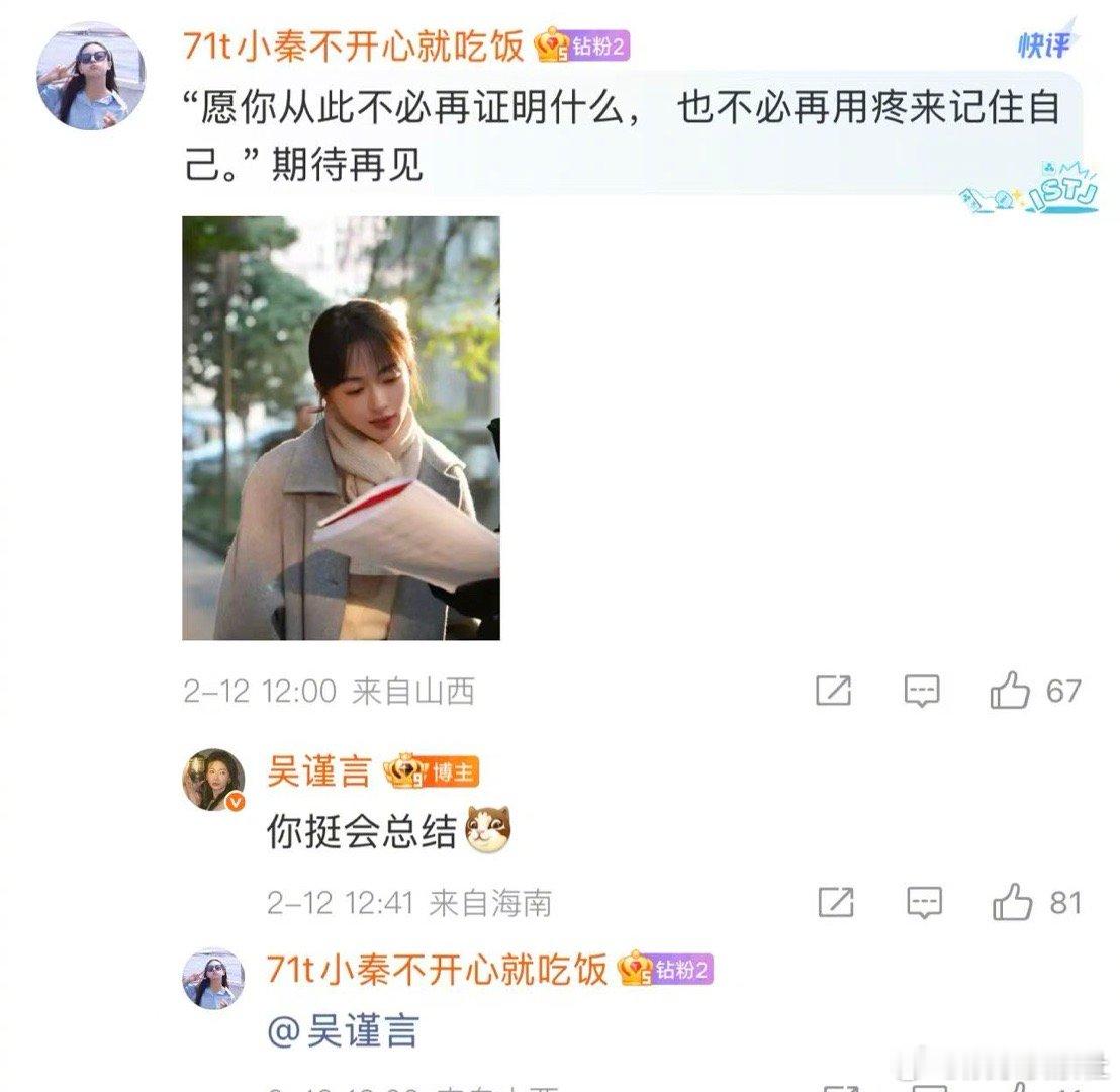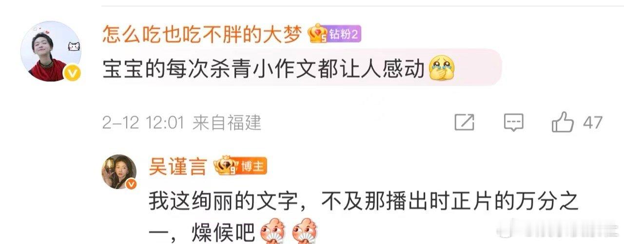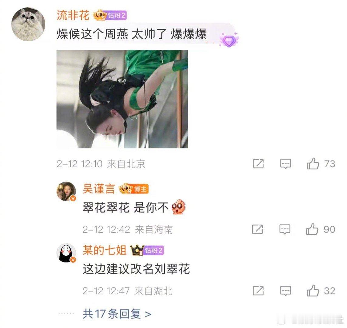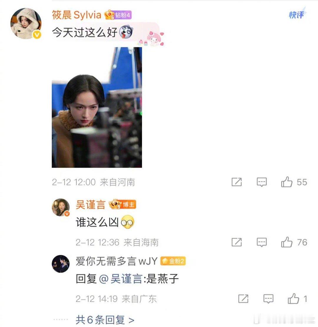 吴谨言加入群聊 哈哈哈哈哈哈哈,吴谨言真的是一刻也闲不下来,刚忙完作品就加入群聊,和大家聊了起来,在评论区和大家聊得好嗨啊,分享角色,分享日常的点点滴滴,这不就是妥妥的生活博主吗,哈哈哈哈哈,吴谨言还调侃翠花翠花是你不,哈哈,好皮的吴谨言啊~新春茶话会