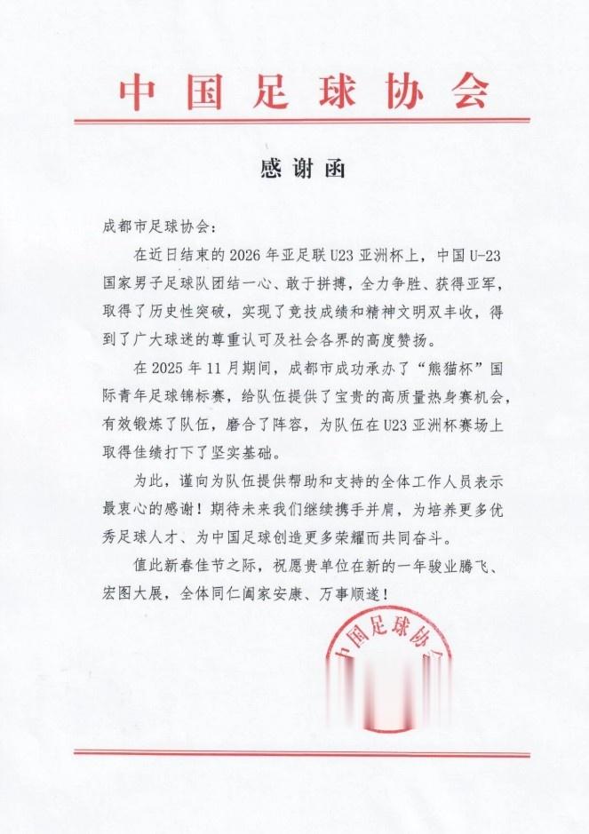 直播吧2月12日讯成都市足协发文,中国足协向成都市足协发来感谢函,就2025“熊猫杯”期间成都市为U23国家队备战亚洲杯所做出的努力和支持,表示隆重感谢!