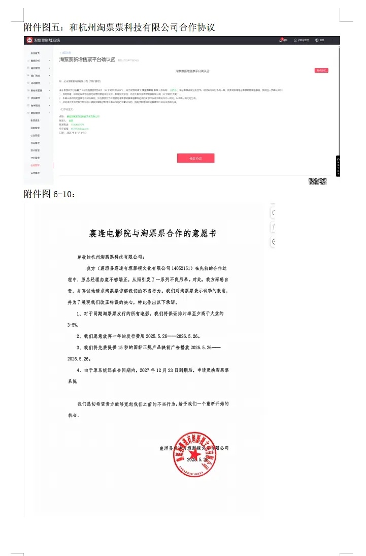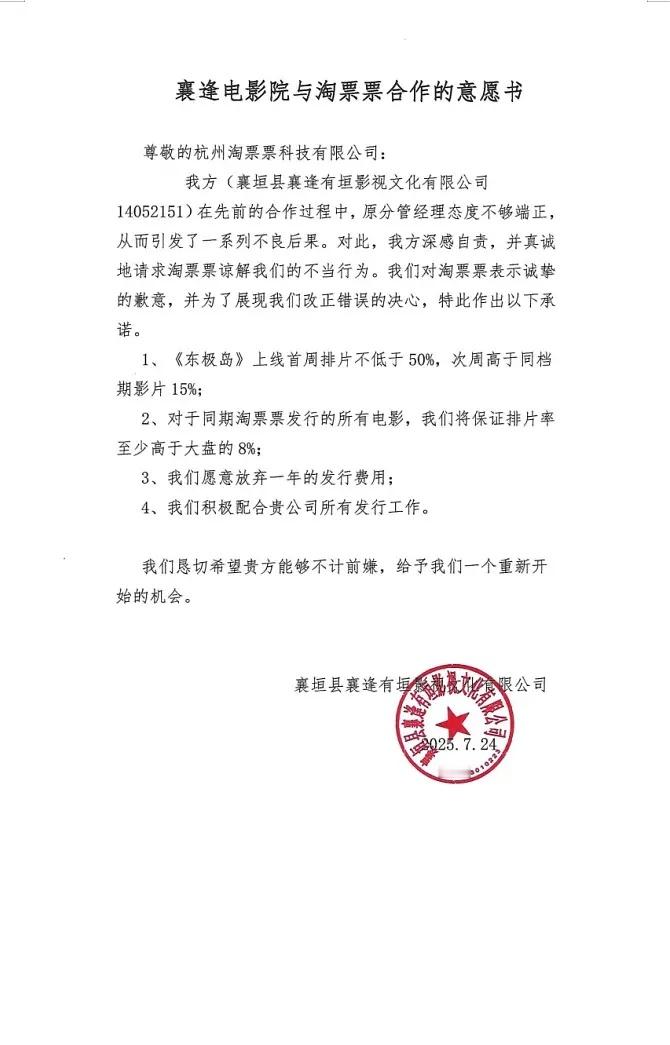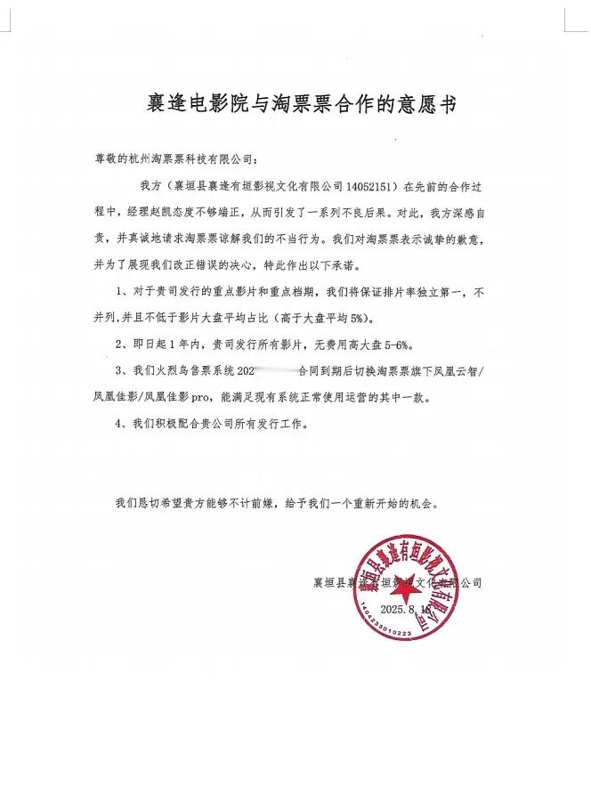 襄逢这个电影院爆了好多料除了惊蛰无声,因为封神2淘票票拿密钥跟接口威胁,影院给淘票票发了好多封特别卑微的意愿书,主动给东极岛、捕风捉影50%高排片求和【态度不够端正,深感自责,请求谅解】 为了改正错误,主动做各种承诺,放弃一年发行费,保证无费用排片高于大盘多少