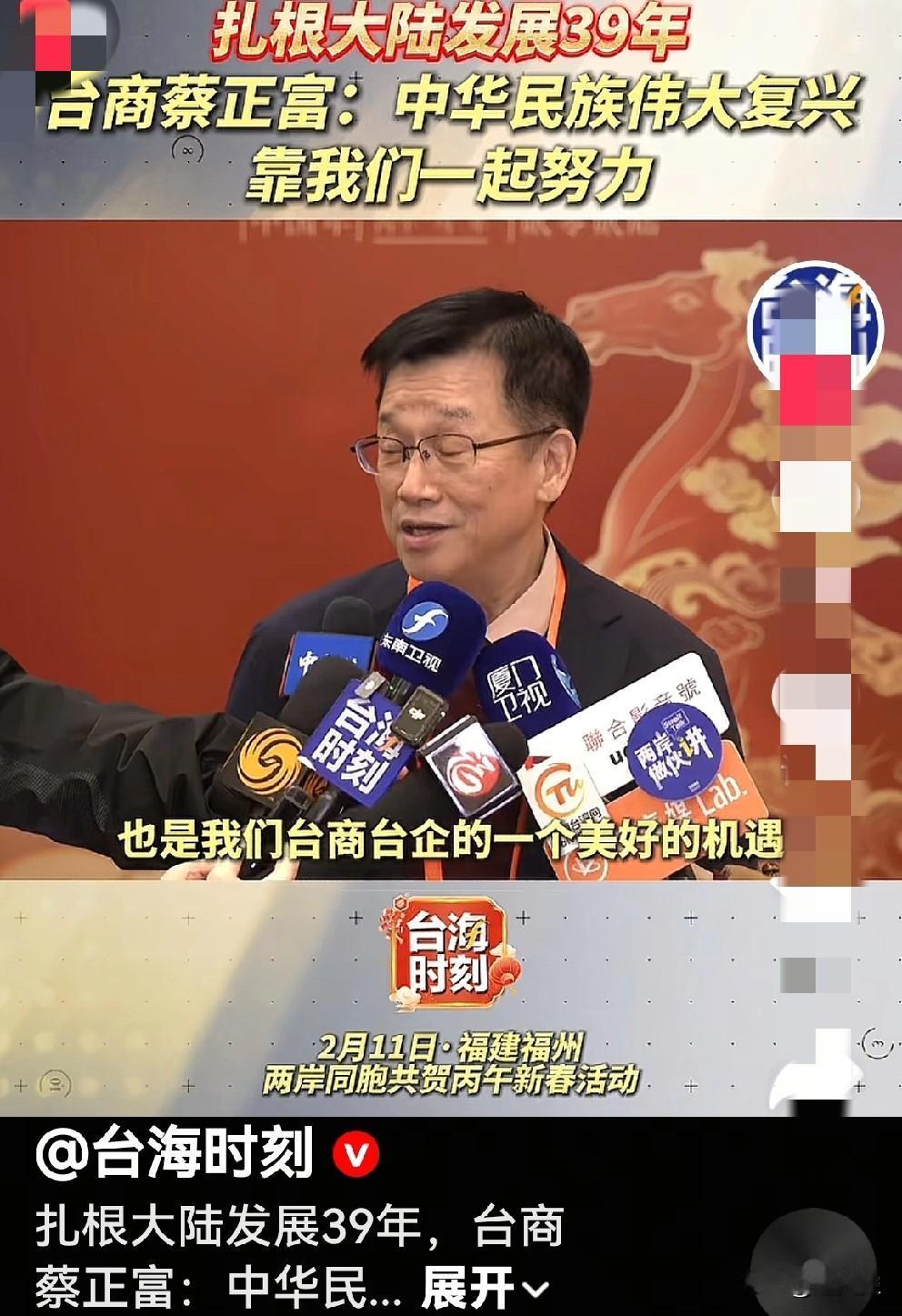 台商蔡正富扎根大陆近四十年,亲历改革开放的进程,从一个小企业开始到现在规模化出口,他用自身的发展向台湾同胞和大陆人民交了一份满意答卷。 他表示大陆的新质生产力发展更是台商机遇,要找两岸年轻人一起发展。他说中华民族伟大复兴需要我们一起去努力。 这才是真正的同胞,感恩,认同祖国,愿以自身事业发展展示国家的力量和未来,我们支持你,愿你团结更多的台湾同胞,携手前行,为祖国统一作出贡献。春节快乐,生意兴隆,祖国越来越好!