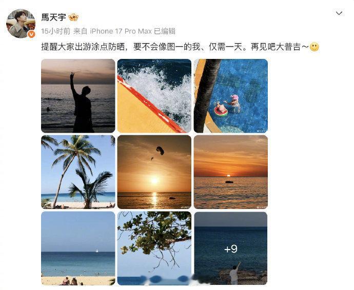 马天宇在普吉岛1天被晒黑 救命,马天宇也太没有包袱了吧! 度假一天喜提“损色儿”,还特意发出来提醒大家注意防晒。虽然黑了几个度,但在粉丝眼里依然是帅气的!这波美黑我给满分!