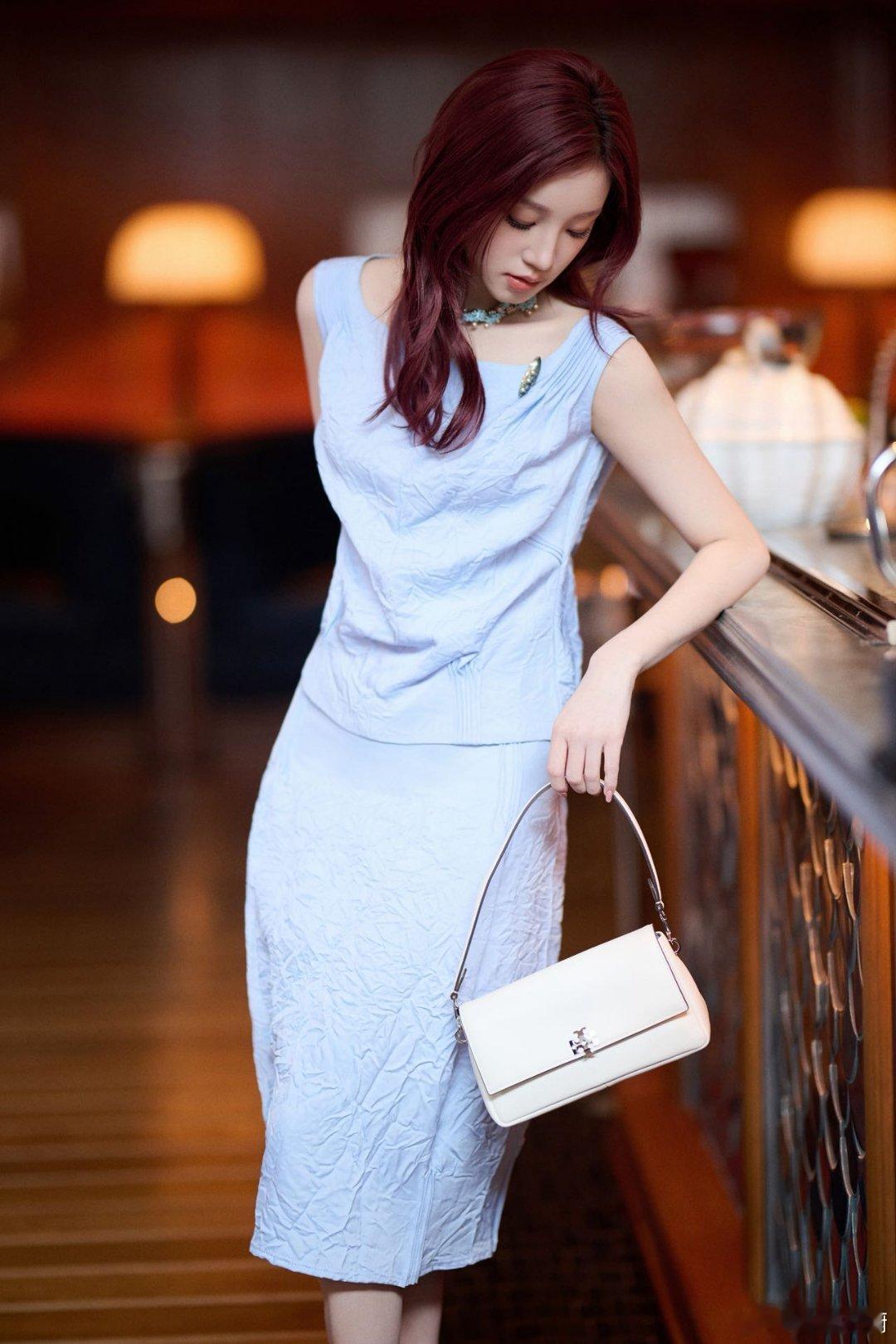 宋雨琦雾蓝裙装勾勒温柔曲线,颈间宝石似晨露轻吻锁骨。手提包与红发共舞,每一帧都是