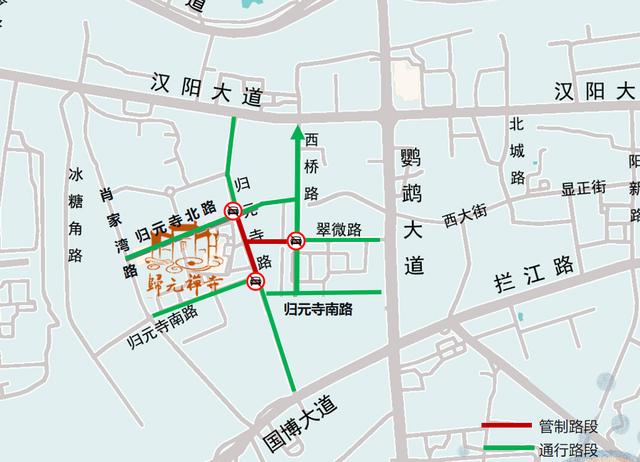核心区域路段:2月16日(除夕)22:00至17日(初一)18:00、2月20日(初四)22:00至21日(初五)18:00,归元寺路、西桥路、翠微路、归元寺北路、归元寺南路、肖家湾路禁止机动车及非机动车通行和停放。
