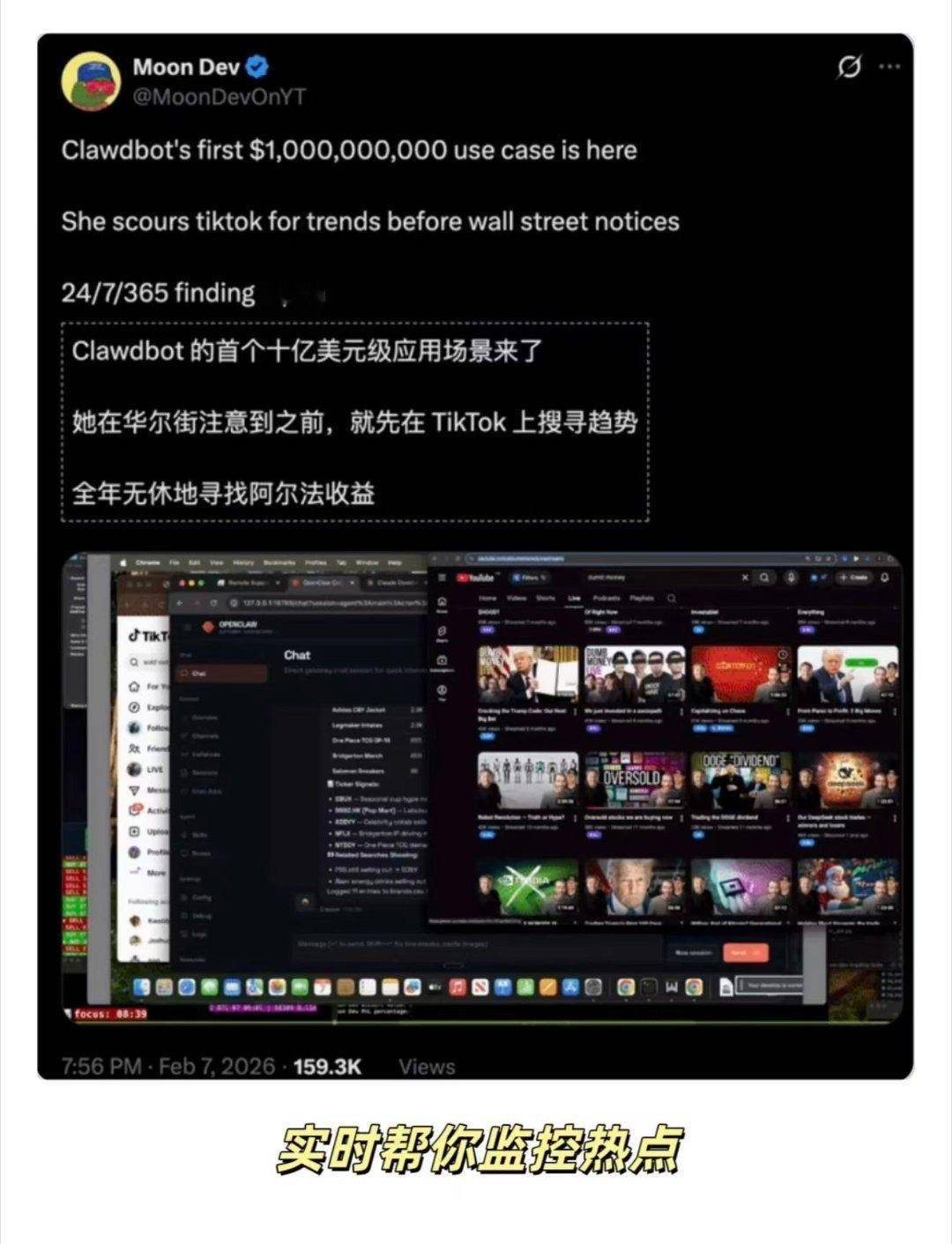 男子用ai一夜赚够一线房首付作为关注 AI 投资的人,我必须说:OpenClaw 的机会真的等不起!它靠高频策略精准捕捉市场利差,每一个投资机会都转瞬即逝,而眼下,正是最关键的窗口期。作为海外投资圈的新晋宠儿,OpenClaw 早已用实力把 AI 投资的想象拉满:有人用它监控推特舆情 + 强化学习,7×24 小时自动操盘股票、加密货币交易,小本金就能撬动大收益;有人靠它在平台发布内容 “找投资”,竟成功吸引真格投资合伙人的 AI 关注,项目直接被列为高优项目;不止实战强悍,它还能搭建全球股票实时行情面板,汇总各大指数动态,定时推送行情、异动提醒,直接把投资研究效率拉满。值得一提的是,百度将于近期接入OpenClaw,后续还将联动小度、文库等生态产品,让普通人也能轻松用上专业 AI 投资工具。国外玩家早已靠它抢占先机,打破传统投资的信息壁垒,人工操作根本跟不上 AI 的速度。窗口期转瞬即逝,只有早布局,才能吃到早期红利。