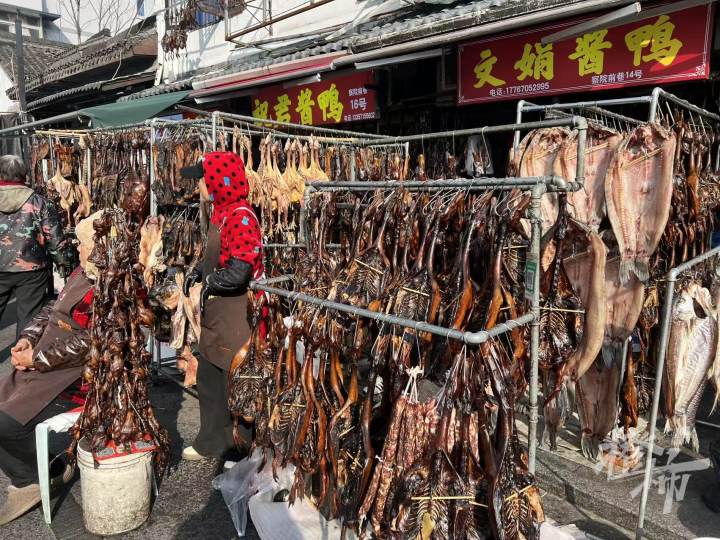 从太庙广场这一头沿着察院前巷走过去,一路的酱货依旧壮观。文娟酱鸭的老板娘说,这几天是年前销售冲刺阶段,好比青鱼干,昨天统统卖光了,今天刚拿出来几条,酱鸭每天也要卖100多只。虽说春节期间不放假,但到除夕前酱鸭数量还剩多少就不好说了,所以想买的话可以赶早。