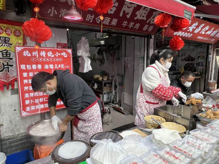 杭州人的年夜饭里,总少不了蛋饺。这几天大马弄的小左金元宝蛋饺的队伍几乎没有断过,早上下午都有人在排队,两个灶头,一次总共只能做4只蛋饺,老板娘双手不停地重复着倒蛋液、放肉馅、给蛋饺翻身……围观的顾客隔着玻璃一边评价:“她这个蛋饺看上去清爽,鸡蛋都是现打的,肉馅也新鲜”,一边感叹:“(老板娘)这样子肱二头肌要练出来的嘞!”
