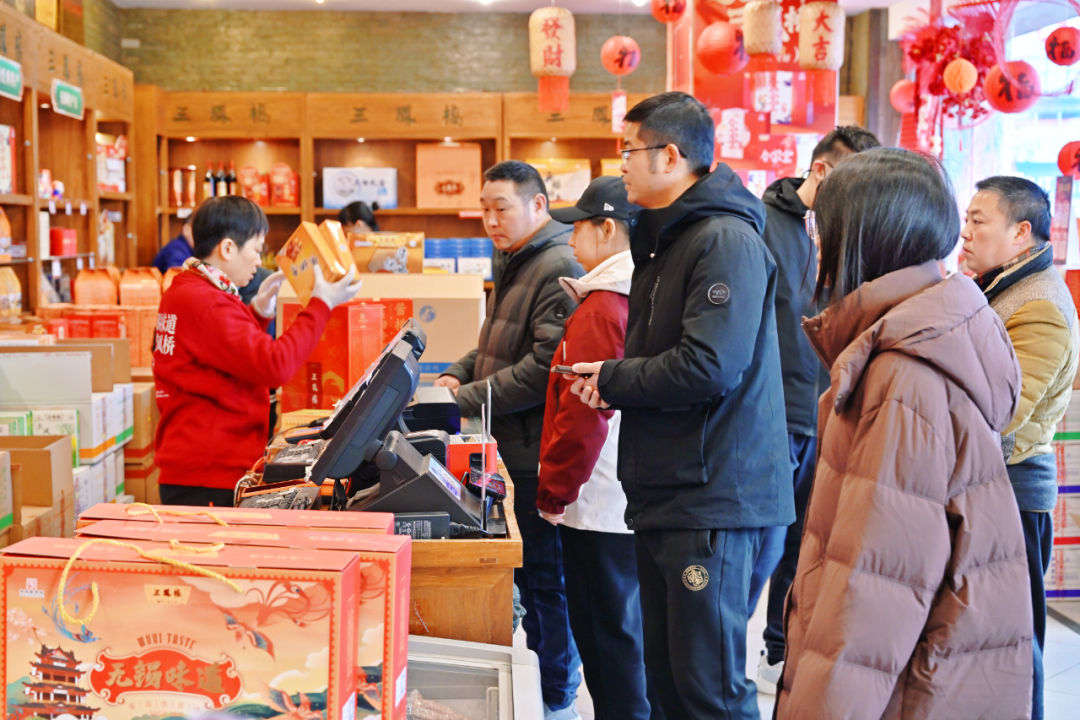 中山路上的三凤桥肉庄早已挤满了人。从门口望进去,店内热气腾腾,柜台前队伍挨挨挤挤,全是置办年货的“老无锡”。油亮亮的酱排骨、酥颤颤的红烧蹄膀,老味道的扎实香气是过年期间必不可少的滋味。