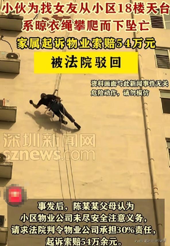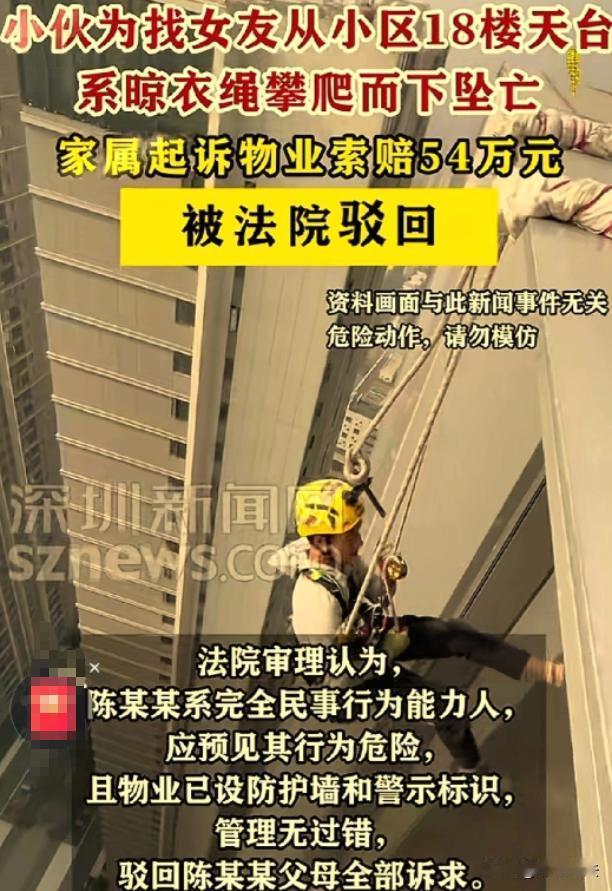 浙江宁波,24岁男子陈某为了尽快见到女友,不走正门反而从18层顶楼天台冒险攀爬外墙。他用晾衣绳绑在楼顶管道和自己腰上,试图顺着外墙下去,不料绳子断裂,陈某从18层坠下当场离世,陈某父母认为物业未尽安全防护责任,将其告上法院索赔54万。法院经审理后驳回了他们的诉讼请求。 爱情,有时候真能让人冲昏头脑。 24岁的陈某,正和女友热恋。一日不见,如隔三秋。 那天清晨,天还没完全亮透,陈某就迫不及待开着车,往女友所在的小区赶。 到了小区,他没走正门。他想快点见到女友,一秒都不想多等。 他坐上电梯,直奔18层顶楼天台。 天台的小门敞开着,上面还搭着晾衣架。物业为了方便业主晾晒衣物,平时就不锁这门。 天台的防护墙挺高,墙上还贴着“禁止攀爬,危险”的标识。 陈某看到了,可他没当回事。他眼里只有快点见到女友的念头。 他拿起一根晾衣绳,一端绑在天台的管道上,一端系在自己腰上。他拉了拉绳子,觉得挺牢固。 然后,他翻越防护墙,开始顺着外墙往下爬。 绳子突然就断了,陈某从18层的高楼,直直坠了下去。 当场,人就没了。 白发人送黑发人,陈某的父母觉得,物业有责任,天台门没锁,晾衣绳也在那里放着,这才导致了悲剧的发生,他们把物业告上了法院,索赔54万。 很多人觉得,物业多少得担点责任。 可法院经审理后,驳回了他们的诉讼请求。 有人说,陈某都24岁了,是成年人了,他明知道攀爬外墙危险,墙上还有警示标识,可他还是去做了,这能怪谁呢? 成年人了,得为自己的行为负责。不能一出事,就想着找别人背锅。 也有人说,物业也有做得不到位的地方,天台门敞开着,晾衣绳也没管理好,要是物业把门锁上,或者把晾衣绳收起来,说不定就不会发生这样的悲剧了。 可物业设置了防护墙和警示标识,已经尽到了自己的责任,天台门敞开,也是为了方便业主晾晒衣物,保证消防通道畅通。 要是连成年人自己都不珍惜生命,别人再怎么防护,又有什么用呢? 本案法律解析: 物业是否应对陈某的离世,承担赔偿责任呢? 根据《民法典》第942条规定,物业应采取合理措施保护业主人身安全,但安全保障义务并非无限责任。 物业已设置防护墙和警示标识,天台门敞开是为方便业主和消防通道畅通,已尽到合理限度的安全保障义务。 陈某作为完全民事行为能力人,无视警示标识冒险攀爬,属于《民法典》第1174条规定的受害人故意造成损害,物业无需承担责任。 最终法院驳回原告诉求,符合过错责任原则,即行为人仅对自身过错导致的损害负责。 陈某用晾衣绳攀爬外墙的行为,是否违法呢? 陈某的行为,违反了《民法典》第286条关于业主应当遵守法律、法规以及管理规约的规定,同时也违反了《消防法》第28条关于禁止占用、堵塞、封闭疏散通道、安全出口的规定。 虽然其行为未直接侵害他人权益,但破坏了小区公共秩序和消防安全,若造成严重后果可能构成《刑法》第114条规定的以危险方法危害公共安全罪。 不过,由于陈某已离世,不再追究其刑事责任,但需自行承担损害后果。 陈某的父母,能否以“情”为由要求物业补偿呢? 根据《民法典》第1186条规定,受害人和行为人对损害的发生都没有过错的,可以根据实际情况由双方分担损失。 但本案中陈某存在明显过错,物业无过错,不符合公平责任的适用条件。 依据《民法典》第1173条规定被侵权人对损害发生有过错的,可以减轻侵权人责任,而本案中侵权人(物业)无过错,故无需补偿。 最终的判决,也体现了法律对“自甘风险”行为的否定性评价,即成年人应对自己的冒险行为负责。 你认为在类似案件中,法律应如何平衡人情与法理的关系? 爱情固然美好,但不能冲昏了头脑,在追求爱情的路上,安全永远是第一位的。 陈某为了快点见到女友,选择了这么危险的方式,他没有考虑到自己的安全,也没有考虑到父母的感受。 他的父母悲痛是真的,但不能因为悲痛,就把责任推给别人。 物业该做的都做了,这锅不能随便背。 成年人,得为自己的选择负责,明知危险还去做,这不是自己往坑里跳嘛! 有人同情陈某的父母,白发人送黑发人,那种痛苦,不是一般人能体会的,他们只是想为儿子讨个说法,这有错吗? 对此,你怎么看呢?