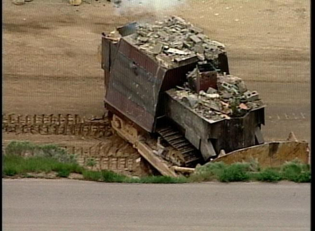 该推土机后部配备一把12.7x99毫米口径的巴雷特M82半自动步枪,前部配备一支5.56毫米FN FNC半自动突击步枪,右侧配有一支.223口径鲁格Mini-14步枪。他的两把随身武器为.357口径马格南左轮手枪和9毫米Kel-Tec P-11手枪。这些武器通过驾驶舱内的小型射击孔发射。