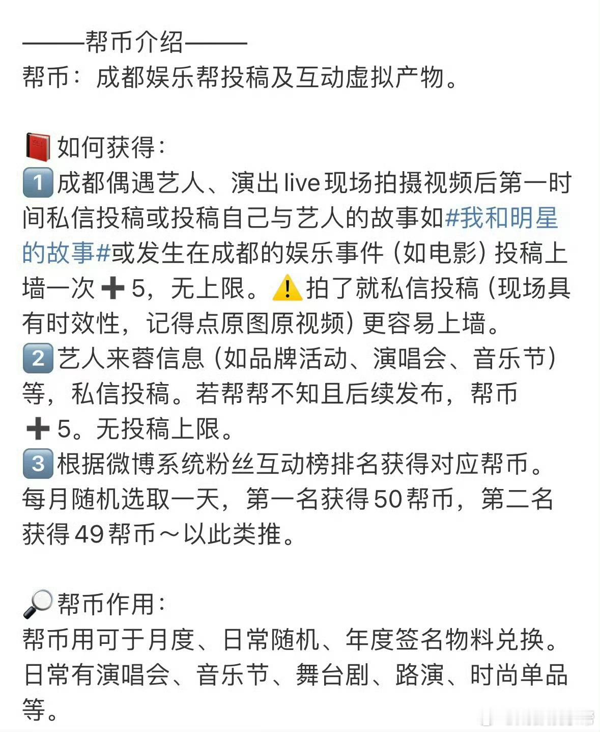 🔎帮币作用:帮币用可于月度、日常随机、年度签名物料兑换。日常有演唱会、音乐节、舞台剧、路演、时尚单品等。✅具体规则:见爱豆或签名物料或周边利器,建议长期拥有,不要自家爱豆来时后悔莫及。规则详见网页链接