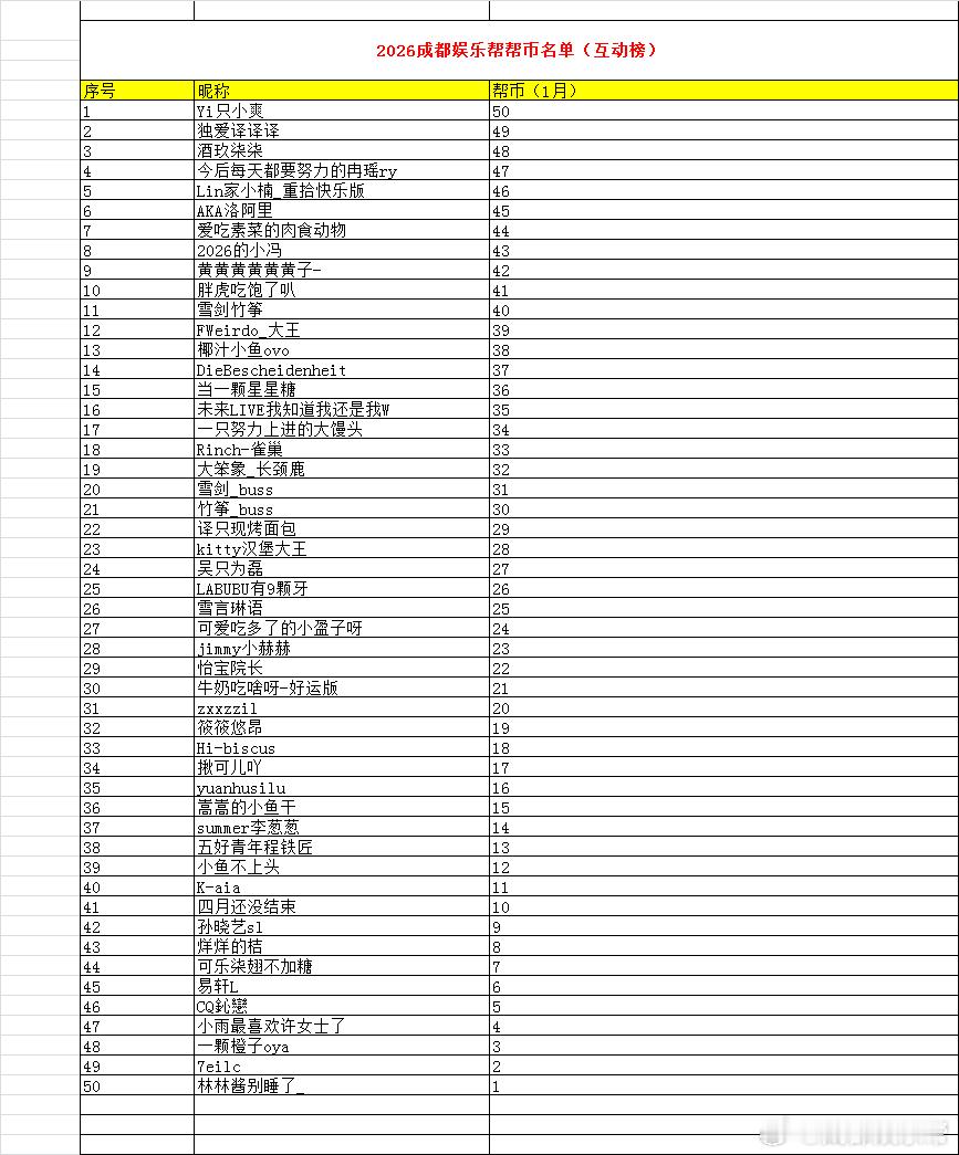 ⚠️帮币稽核:大家可自主查看互动榜排名,若上榜主页无互动行为(在成都娱乐帮赞、评、转均算,根据排名一月需至少10次行为)私信反馈,帮币+10。