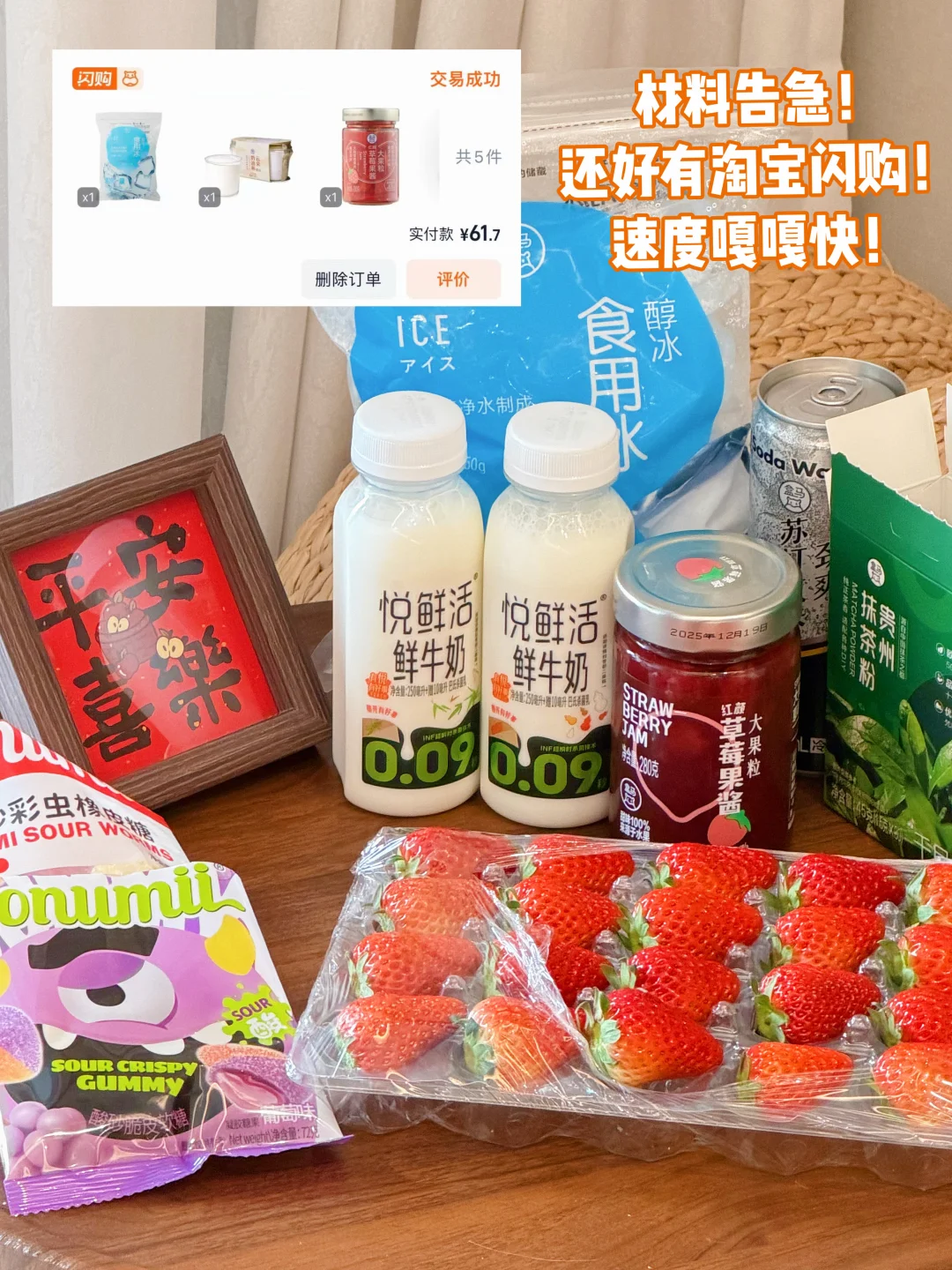 新春聚会开运饮安排上咯✨ 亲测好喝,手残党也能学会的四款特调,颜值口感双在线,亲戚小孩都抢着喝~ 【调制饮品步骤】 忙到准备调饮才发现,草莓、牛奶不够用了..还好翻了翻🍑淘宝闪购,赶紧下单缺的材料,没想到我刚把爸妈冰箱囤的食材整理好,快递就敲门了,这配送速度也太顶了,备年夜饭缺料直接冲就对了!