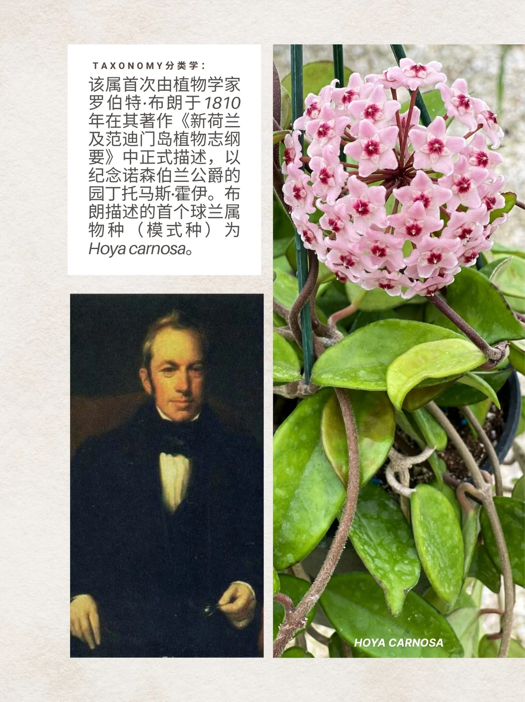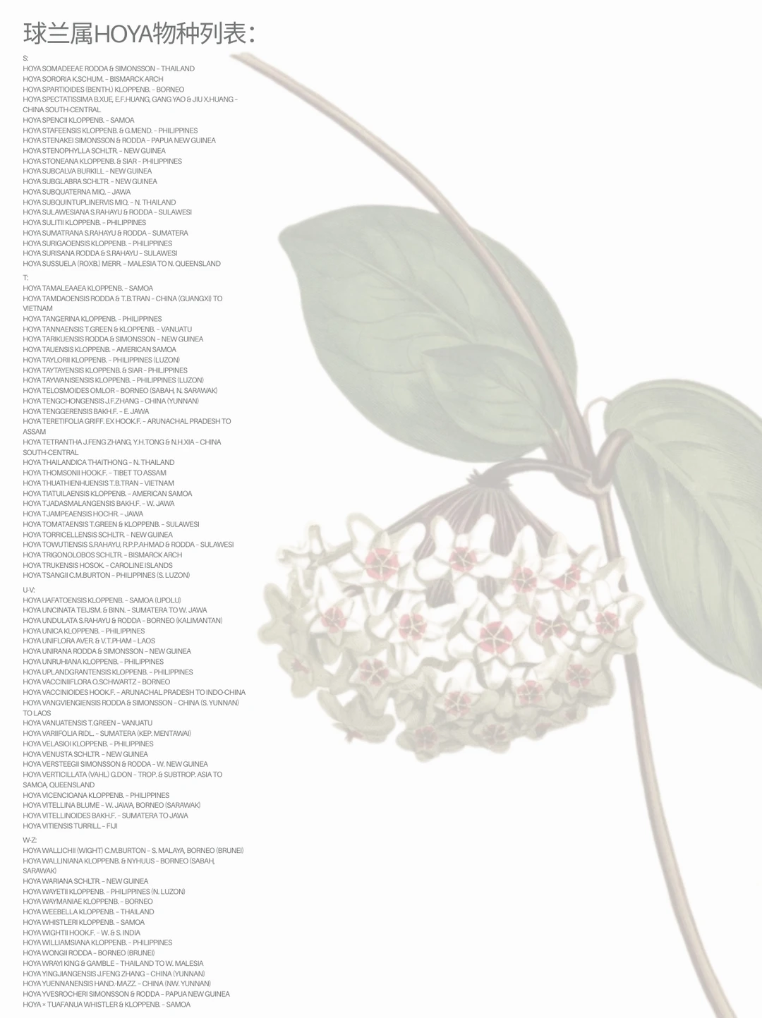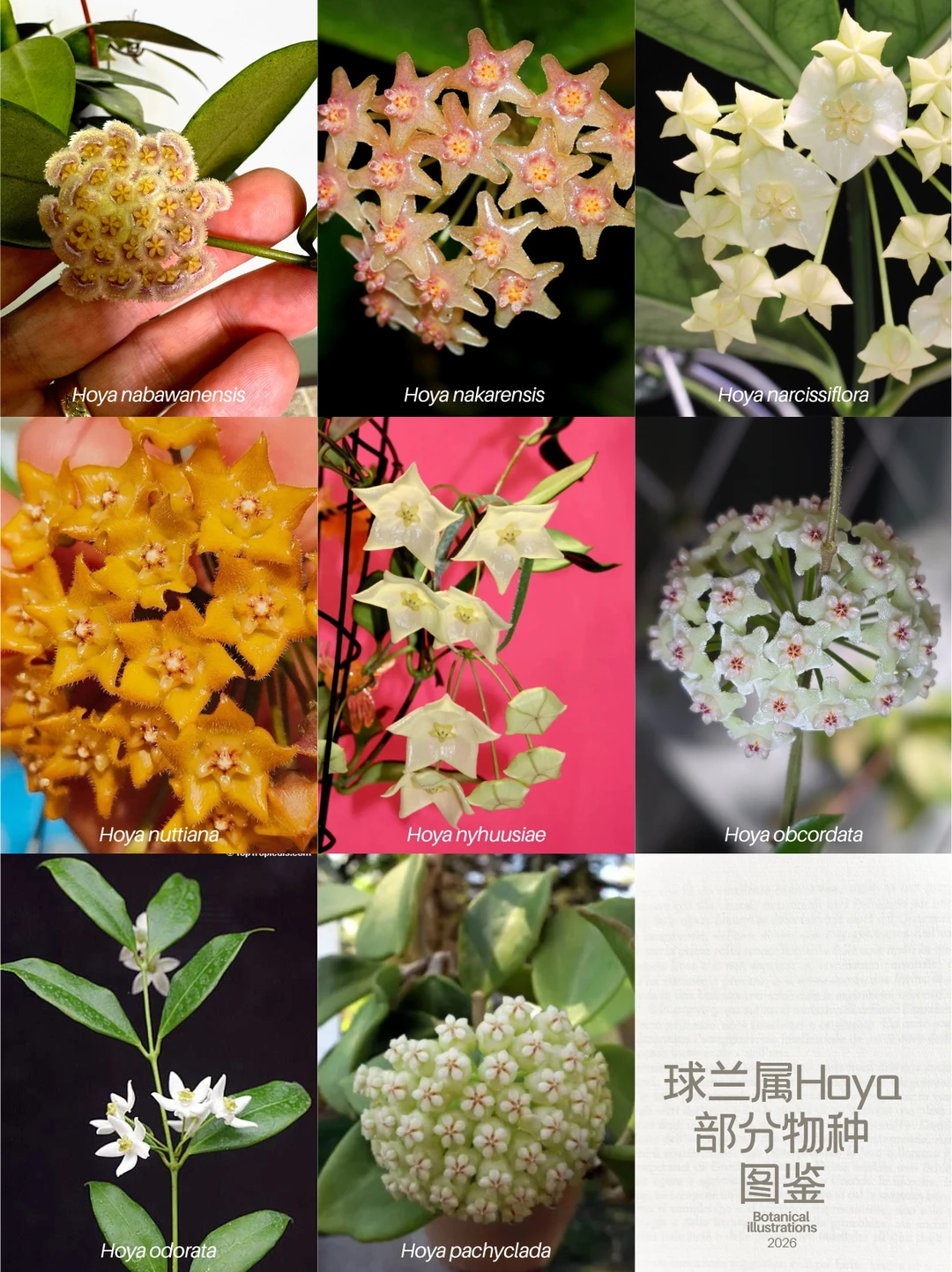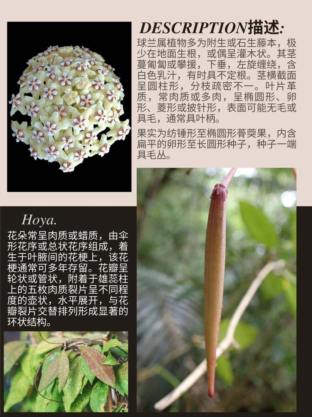 球兰属是夹竹桃科 下拥有超过500个物种的植物属,俗称蜡花。该属植物多为附生或石生藤本,偶见亚灌木形态,具革质、肉质或多肉叶片,花朵呈短管状或钟形,具五枚水平展开的花瓣裂片,花序为伞形或总状,蓇葖果呈纺锤形、圆柱形至椭圆形,内含扁卵形至长椭圆形种子。