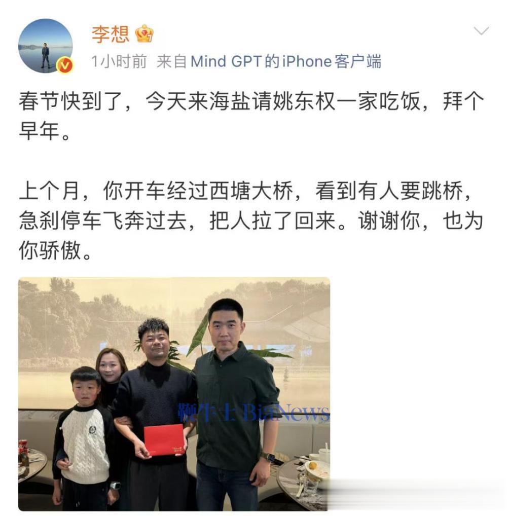 李想在微博发文称:“春节快到了,今天来海盐请姚东权一家吃饭,拜个早年。