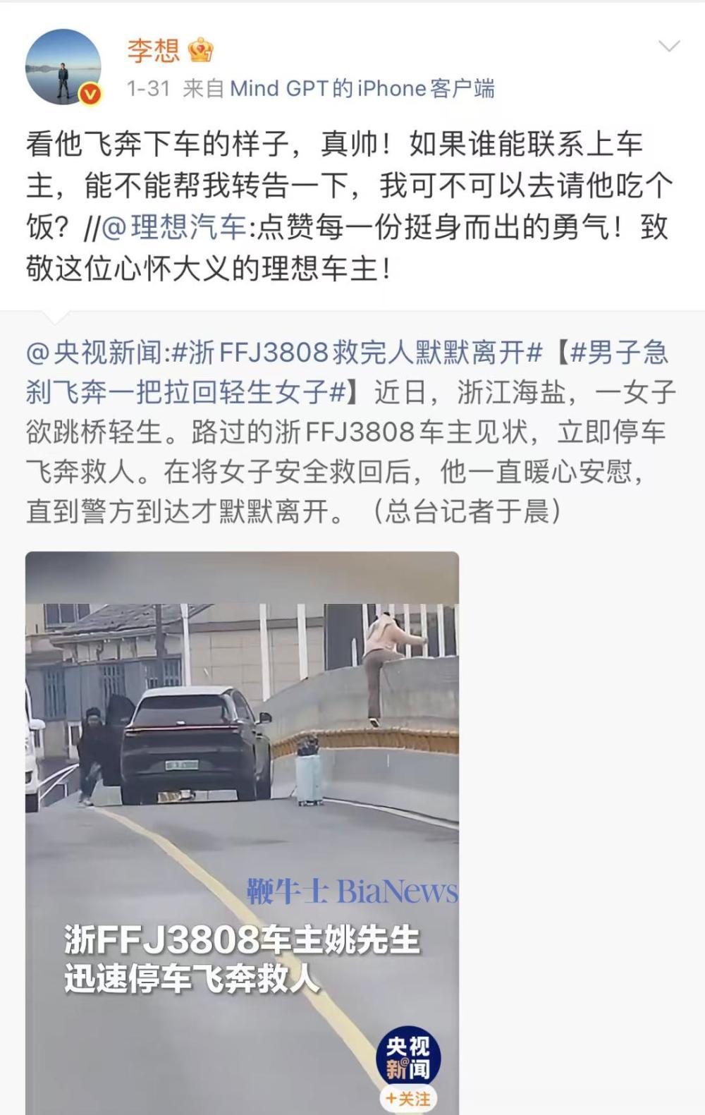 1月31日,李想在微博发文称:“看他飞奔下车的样子,真帅!如果谁能联系上车主,能不能帮我转告一下,我可不可以去请他吃个饭?”