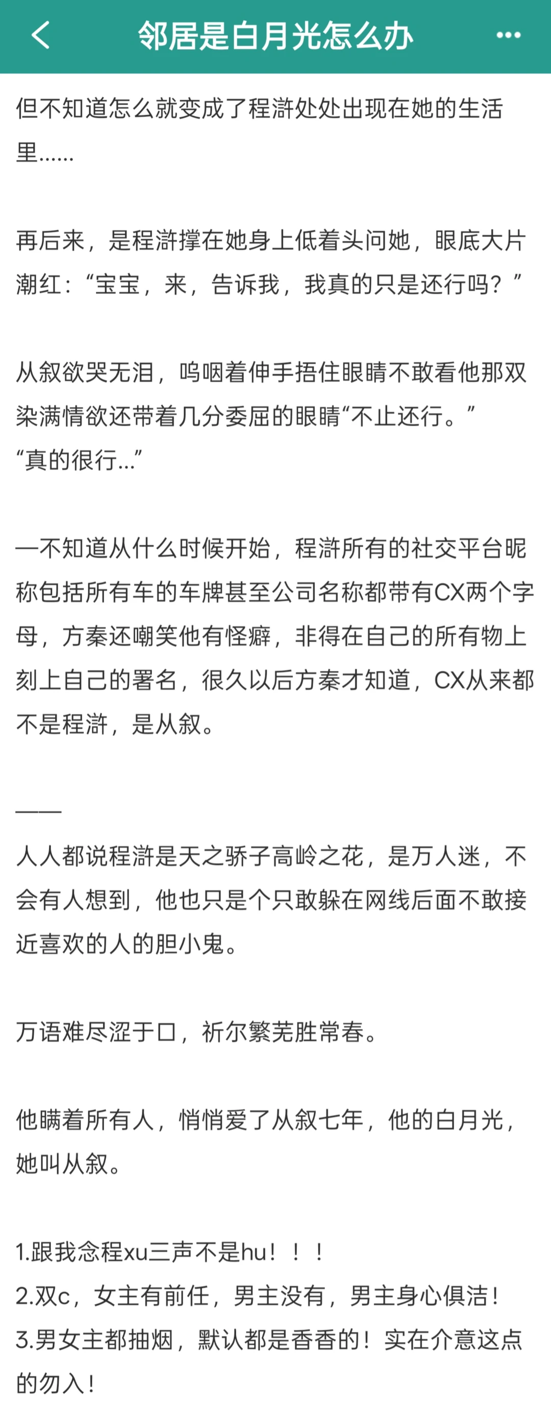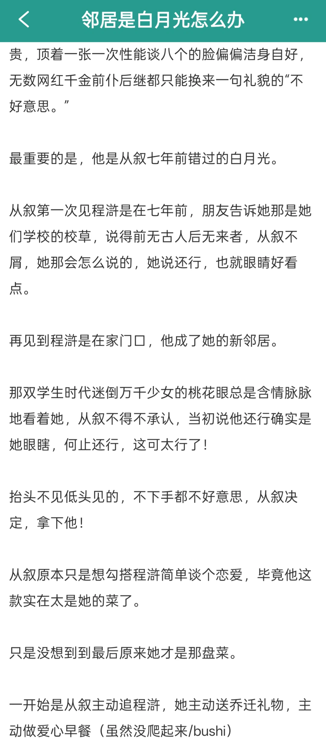 男主蓄谋已久暗恋女主七年,知道女主单身立刻搬到隔壁,就这样嘴上不给vx转头就做爱心早餐,说是女追男其实我们女主根本不用追啊,你就站在那里勾勾手指他就被训成🐶了,男主服务意识超强的!!超会!第1️⃣次还会主动问女主体验,不好他全改,就这么纯情又涩涩! 明天完结!看就完了姐妹们!