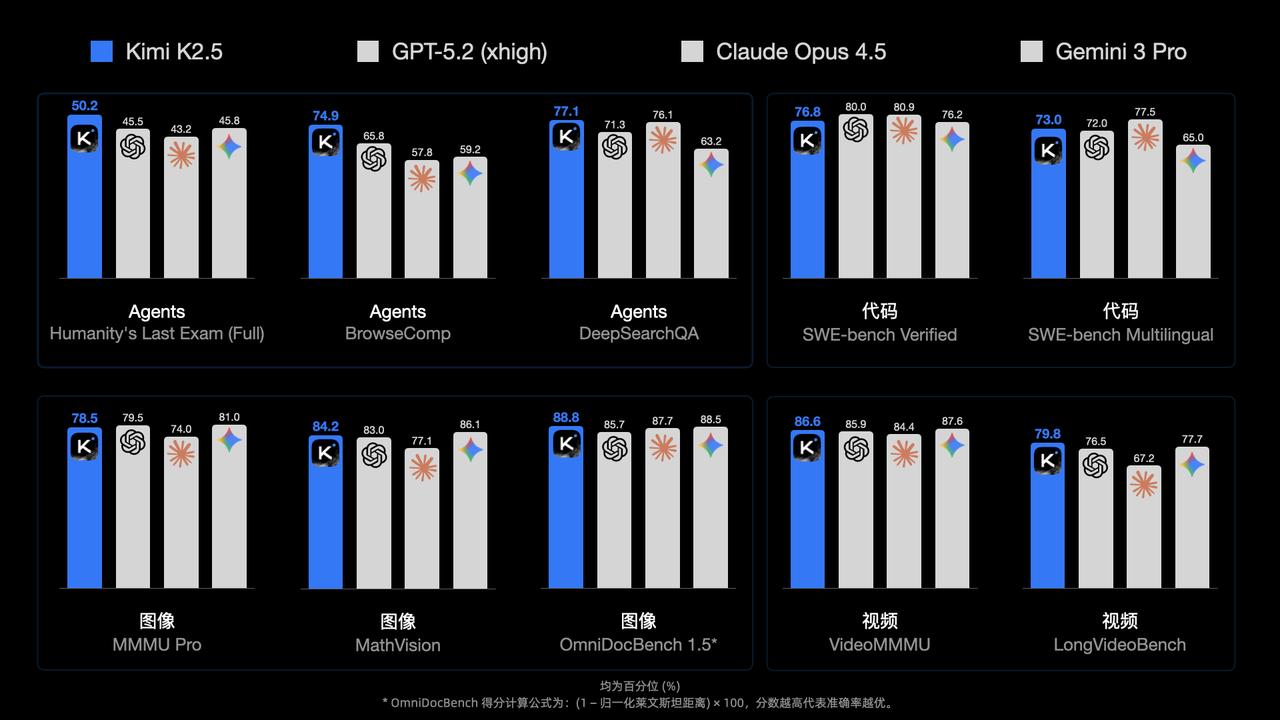 Kimi K2.5 上线:全能 Agent 模型,视觉理解、代码和思考全都搞定 Kimi K2.5 模型正式上线,在 Agent、代码、图像、视频等任务上取得开源 state-of-the-art 表现。该模型支持视觉与文本输入、思考与非思考模式、对话与 Agent 任务,并具备强大的前端代码生成能力。 Kimi Code 编程工具也同步发布,可无缝集成主流编辑器,支持图像和视频编程辅助。它不仅能在终端里直接运行,还能无缝集成到 VSCode、Cursor、JetBrains 和 Zed 等主流编辑器中。 重要亮点 1.Kimi K2.5 模型在多个任务上取得开源 state-of-the-art 表现 2.支持视觉与文本输入、思考与非思考模式、对话与 Agent 任务 3.具备强大的前端代码生成能力 4.Kimi Code 编程工具支持图像和视频编程辅助