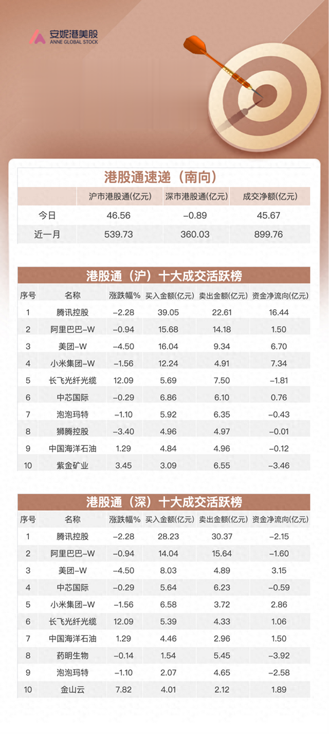 今日港股表现低迷,南向资金逆势流入约45.67亿港元。其中,沪港股通净流入约46.56亿港元,而深港股通净流出约0.89亿港元。