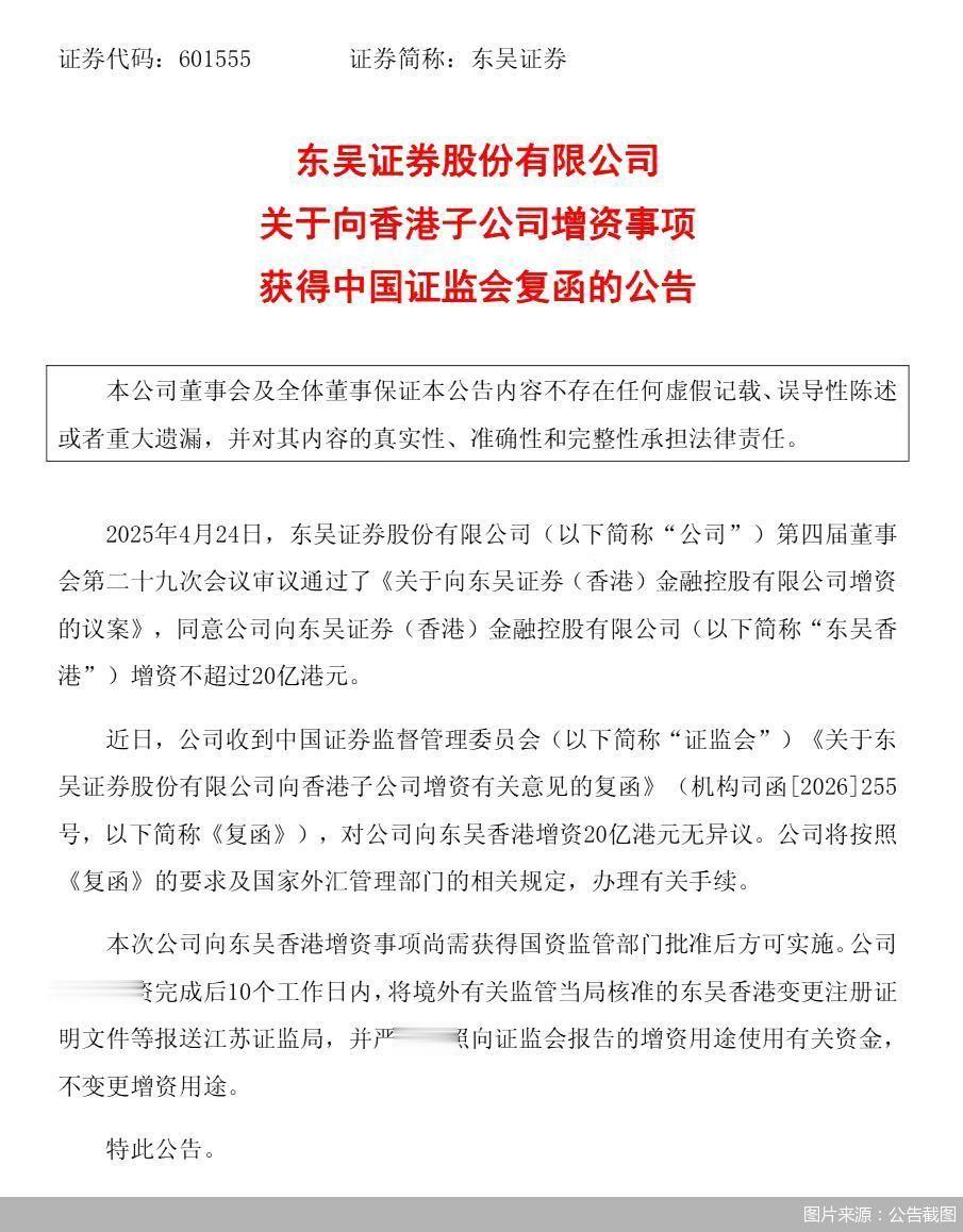 北京商报讯(记者刘宇阳实习生姚榕琰)2月12日,东吴证券发布公告称,东吴证券第四届董事会第二十九次会议于2025年4月24日审议通过议案,同意公司向东吴证券(香港)金融控股有限公司(以下简称“东吴香港”)增资不超过20亿港元。同时,公司近日收到中国证监会《关于东吴证券股份有限公司向香港子公司增资有关意见的复函》,对公司向东吴香港增资20亿港元无异议。