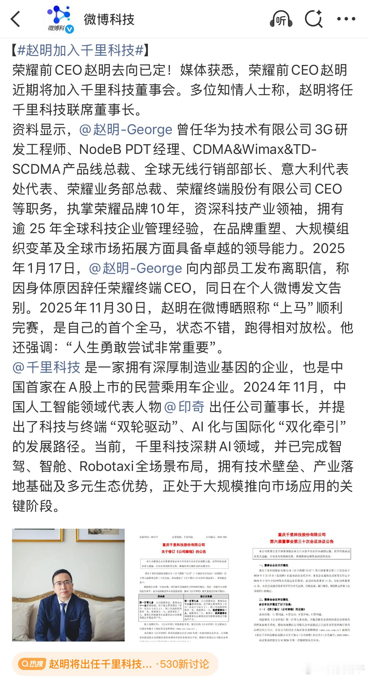 明哥有动向了,赵明加入千里科技 担任联席董事长,之前赵明执掌荣耀10年,完成了从华为子品牌到独立全球品牌的蜕变,证明了他在品牌重塑、组织变革和全球化市场的能力。如今加入千里科技,是从消费电子赛道向智能汽车和AI产业的一次主动跨界,也是他“人生勇敢尝试”理念的践行。