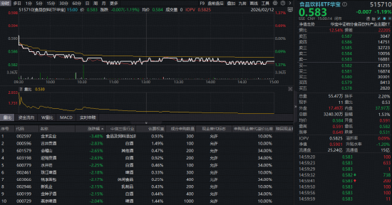 吃喝板块今日(2月12日)继续回调,反映吃喝板块整体走势的食品饮料ETF华宝(515710)开盘后迅速走弱,而后持续低位震荡,截至收盘,场内价格跌1.19%。