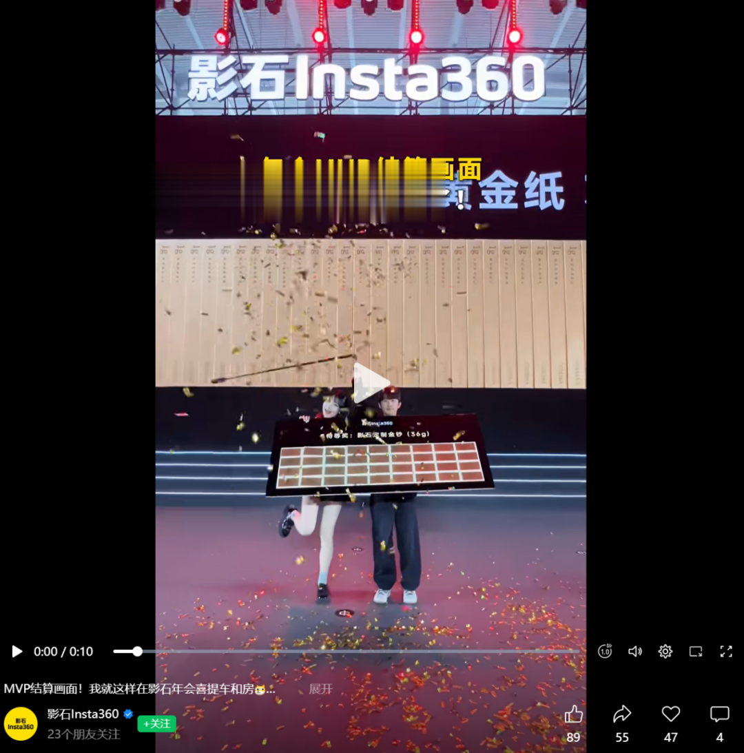 影石官方账号也发布现场视频,并配文称:“MVP结算画面!我就这样在影石年会喜提车和房。”视频由影石X5全景相机拍摄。