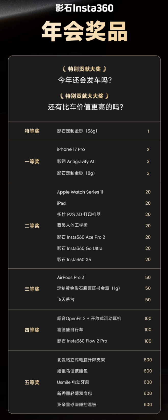 近期,影石Insta360在深圳举办年会,现场奖品阵容相当豪华,引发市场高度关注。