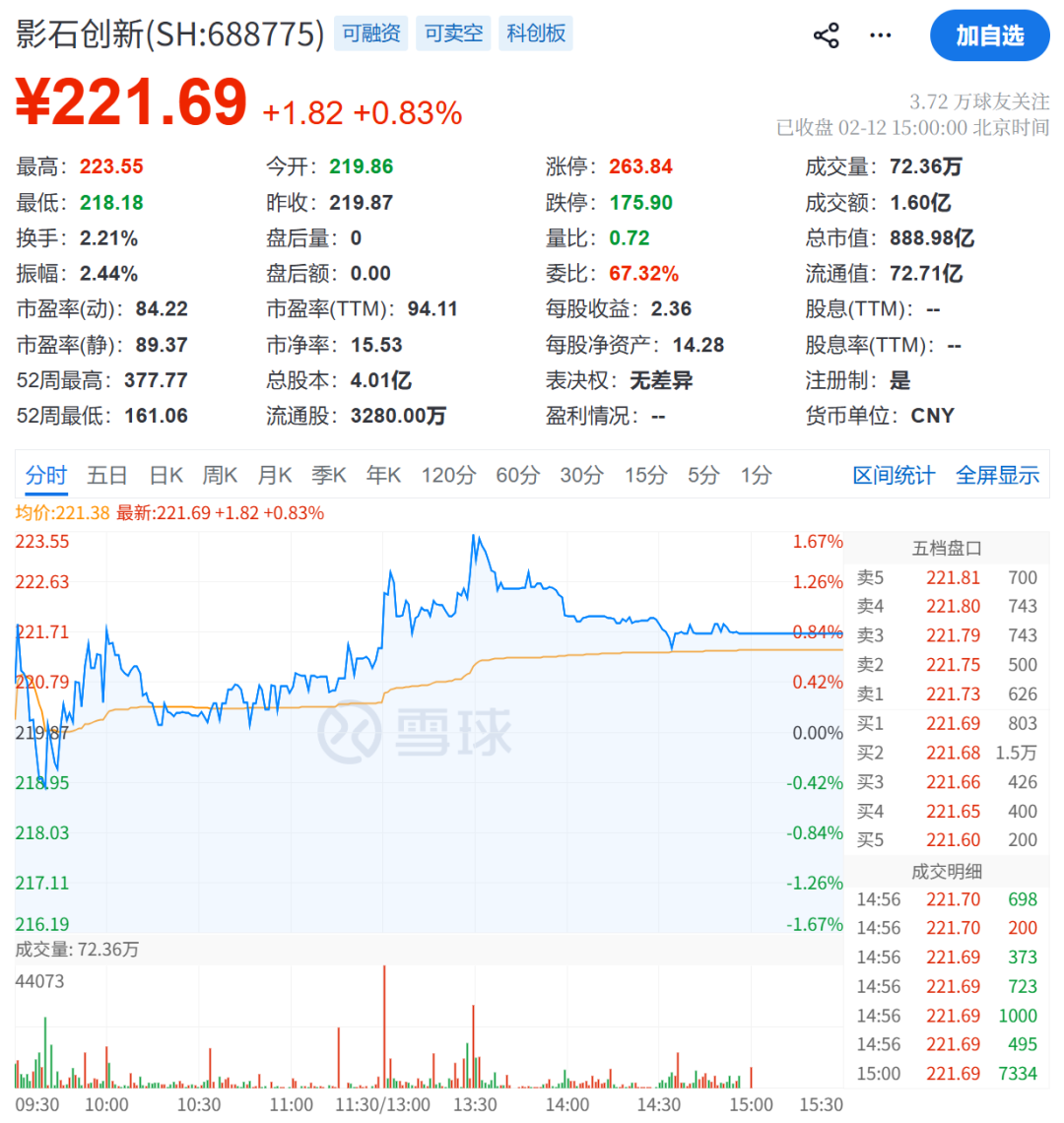 2025年6月,影石创新登陆科创板市场。截至2月12日收盘,影石创新股价为221.69元/股,总市值为888.98亿元。