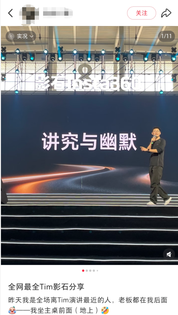此外,影石年会还请到影视飓风创始人Tim(潘天鸿)空降现场并登台演讲,大量员工晒出年会现场及与Tim的合影。