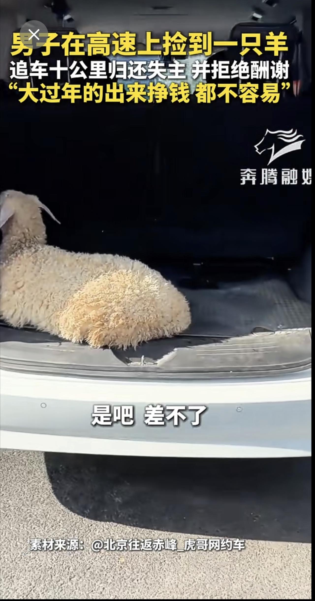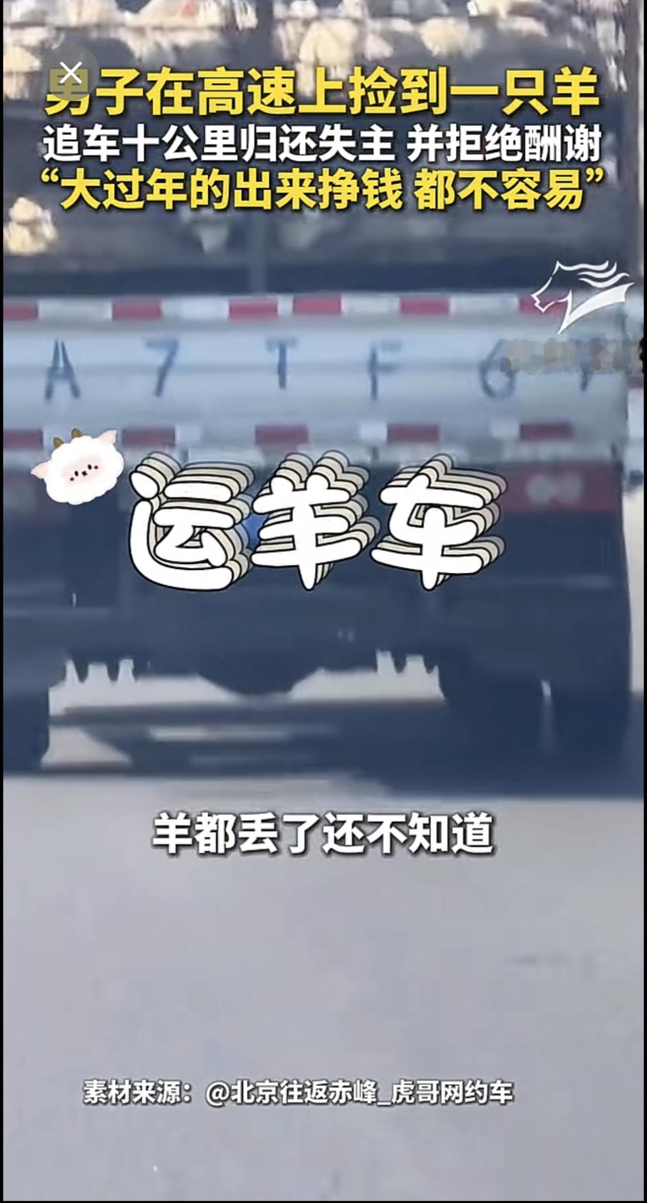 男子在高速上捡到一只羊 追车十公里归还失主 并拒绝酬谢 “大过年的出来挣钱 都不容易” 记者:吴翔隆 审核:梁佳丽 监制:弓春伟 王玉甫