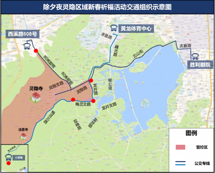 一、2月16日20时至活动结束,西溪路灵溪北路口、灵隐路龙井路口、梅灵北路双峰路口、梅灵北路龙井路口、梅灵南路小牙坞口视情禁止机动车(除公交车、工作用车、沿线单位及居民车辆外)进入灵隐区域;视情实行灵隐路由东向西单向通行、灵隐支路由西向东单向通行措施。