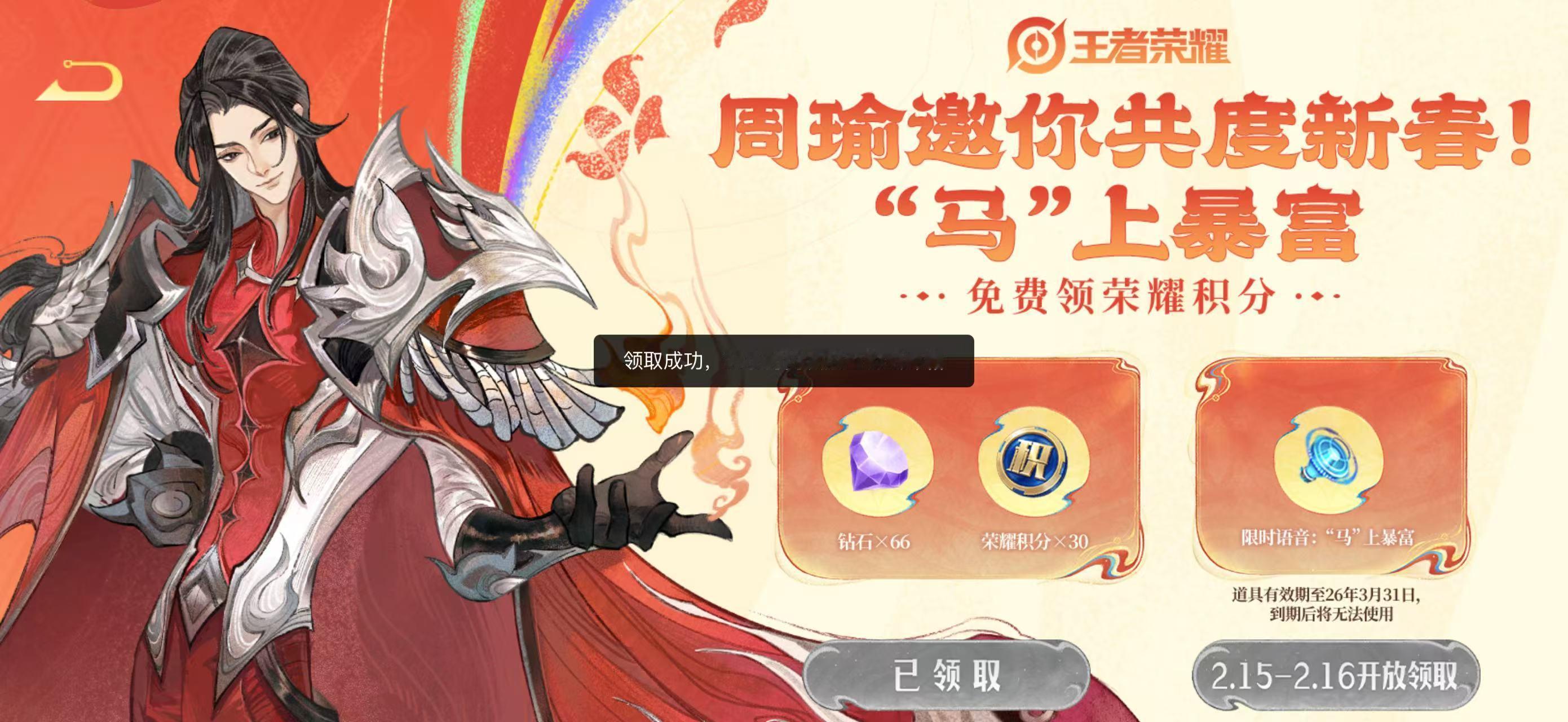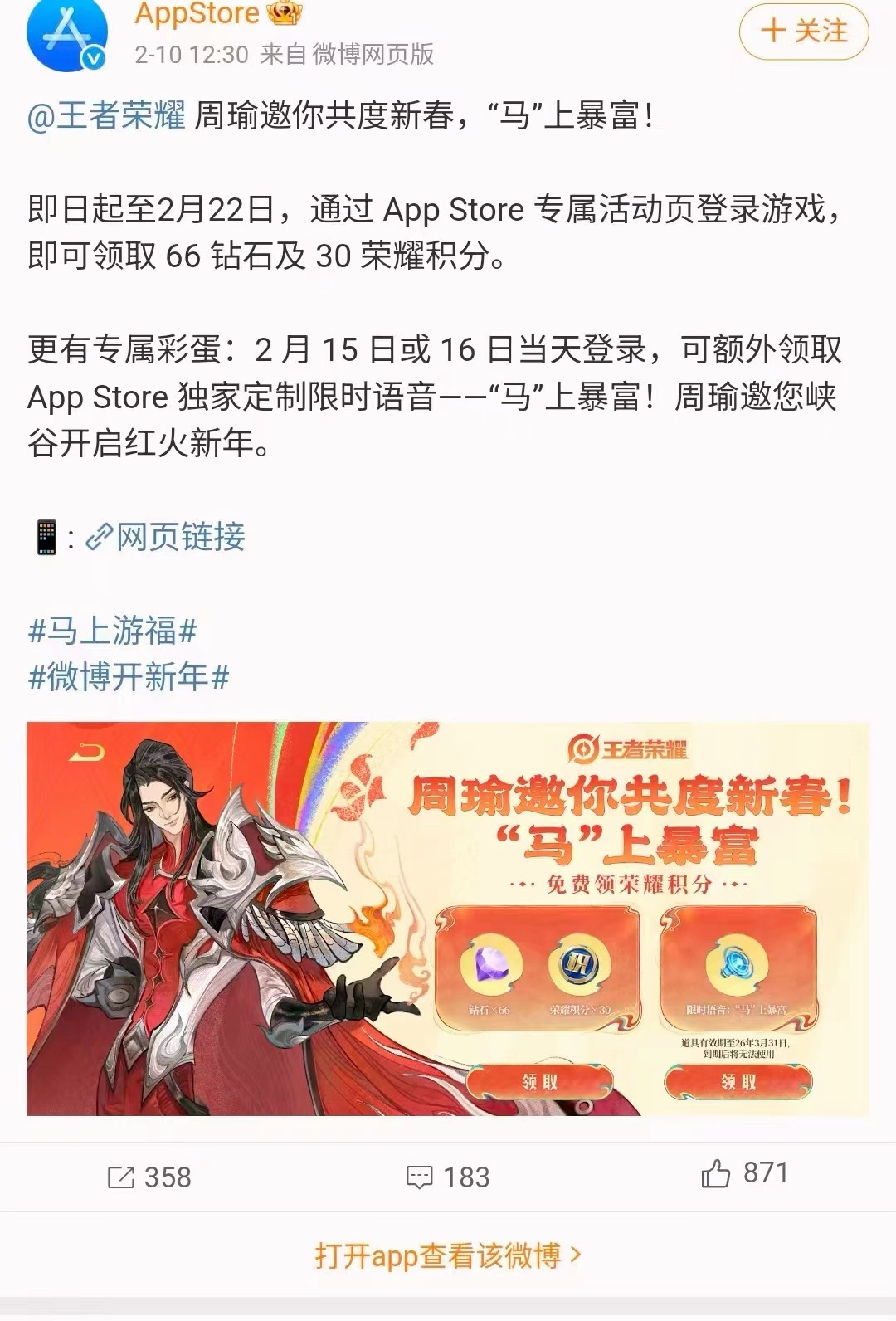 王者新春AppStore有礼苹果王者玩家集合!App Store的新春专属福利别错过啊现在到2.22通过App Store专属活动页登录游戏就能领66钻石+30荣耀积分,白给的福利不薅白不薅重点是15、16号还有定制语音“马”上暴富!闹钟已设好,这波新年财运必冲领完的宝子晒出领礼截图,一起蹲新年专属语音包~