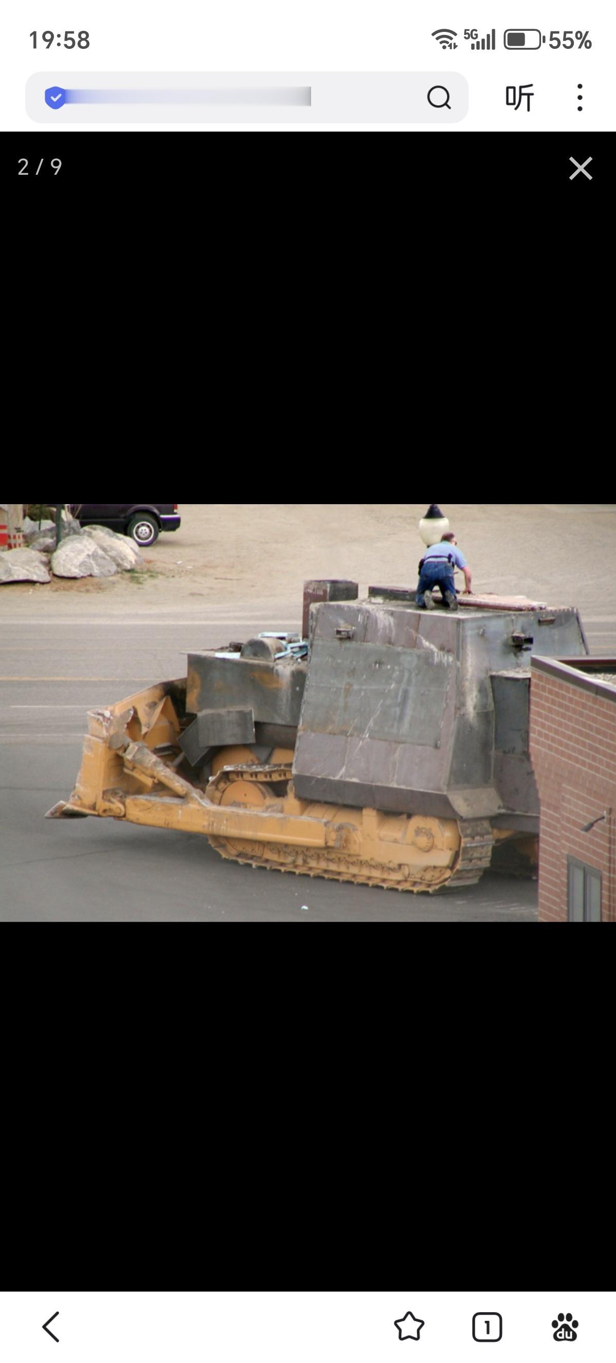 马文·希迈尔的装甲推土机(“KILLDOZER”),他驾驶这辆自制的“坦克”几乎摧毁了一整个美国小镇。 装甲推土机基于的标准型49吨小松D355A推土机搭载一台410马力(305千瓦)发动机,公路最高时速为7.45英里(12公里),每吨功率为8.36马力。希迈尔改造的装甲版将重量提升至61吨,这使推土机速度有所降低,每吨功率降至6.7马力。 该推土机后部配备一把12.7x99毫米口径的巴雷特M82半自动步枪,前部配备一支5.56毫米FN FNC半自动突击步枪,右侧配有一支.223口径鲁格Mini-14步枪。他的两把随身武器为.357口径马格南左轮手枪和9毫米Kel-Tec P-11手枪。这些武器通过驾驶舱内的小型射击孔发射。 推土机的装甲由两块半英寸(12.7毫米)钢板构成,中间填充混凝土并安装复合有机玻璃,形成了复合装甲。事实证明,这种装甲对轻武器火力、穿甲弹和手榴弹非常有效。希迈尔通过连接到内部显示屏的摄像头用于观察周围环境,摄像头的镜头由三英寸(76.2毫米)防弹塑料保护。此外,这辆装甲推土机还配备了精密的空气过滤系统和空调系统。