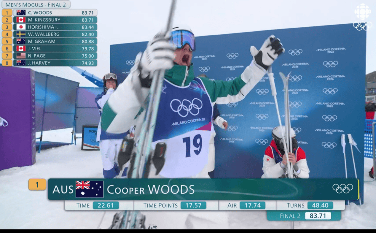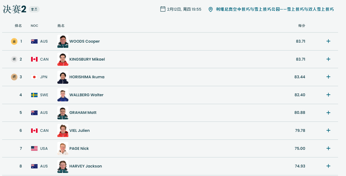 虎扑02月12日讯刚刚结束的自由式滑雪男子雪上技巧决赛,澳大利亚选手库珀-伍兹第二滑获得83.71分,凭借技术分的优势获得金牌。